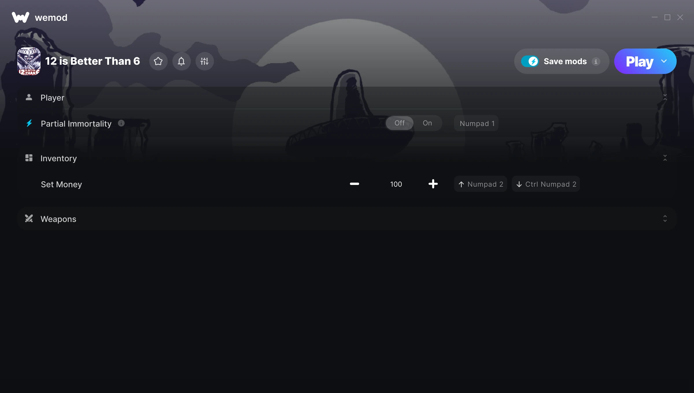 Come uso i trucchi in 12 is Better Than 6?WeMod mostrerà in modo sicuro tutti i giochi sul tuo PC. Apri un gioco dall'elenco e premi semplicemente play. Dopo che il gioco si è caricato e una volta che sei in gioco, puoi iniziare ad abilitare diversi trucchi!Funzionerà con la versione del mio gioco?WeMod utilizza tecnologia avanzata per rilevare la versione del gioco che stai eseguendo e ti farà sapere se è supportata. Se non lo è, avrai comunque la possibilità di provarlo o richiedere un aggiornamento!