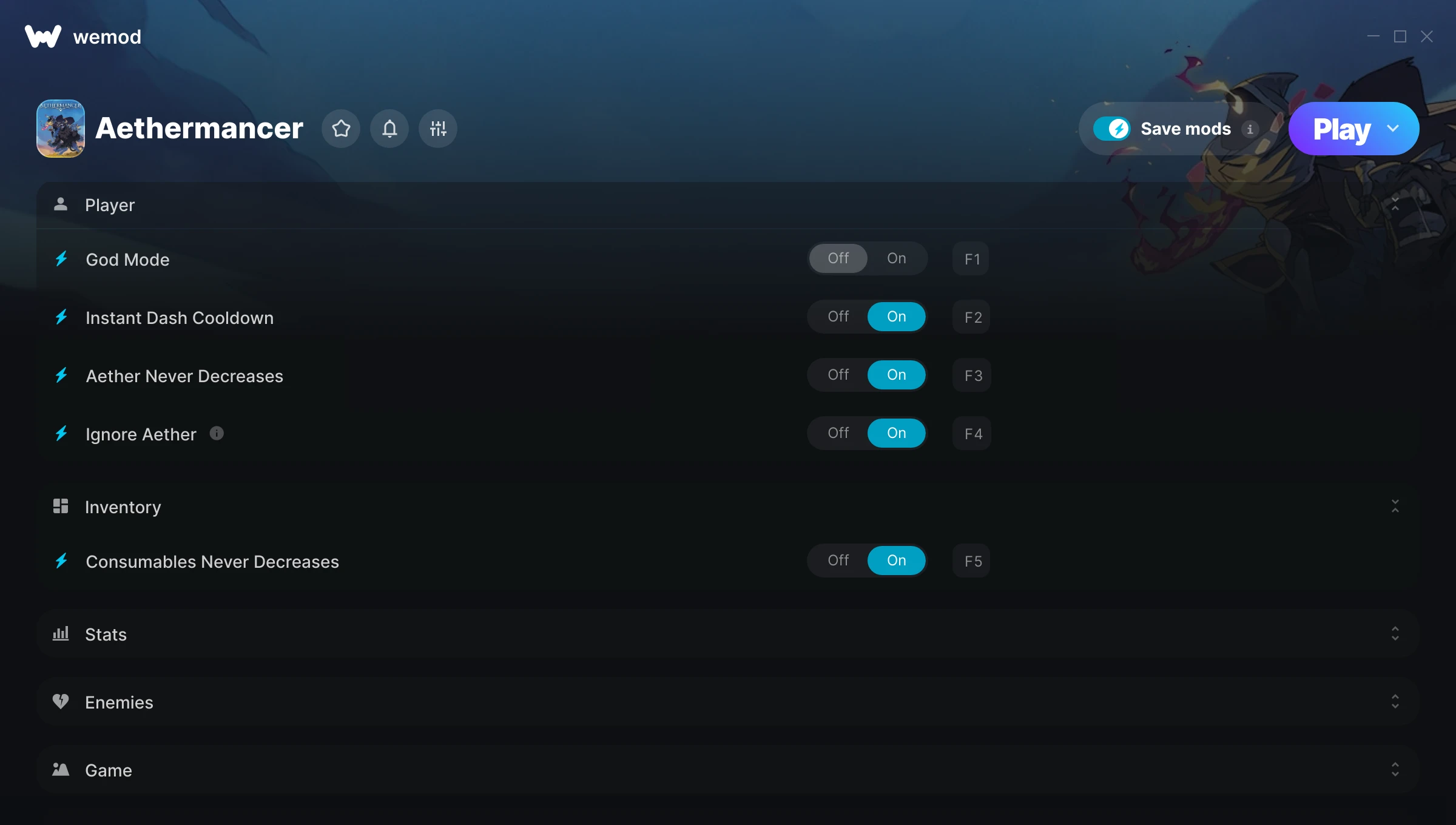How do I use the cheats in Aethermancer?WeMod will safely display all of the games on your PC. Open a game from the list and simply press play. After the game loads and once you’re in-game, you can start enabling different cheats!Will this work with my game version?WeMod uses advanced technology to detect the game version you’re running and will let you know if it’s supported. If it’s not, you will still have the option of giving it a try or requesting an update!