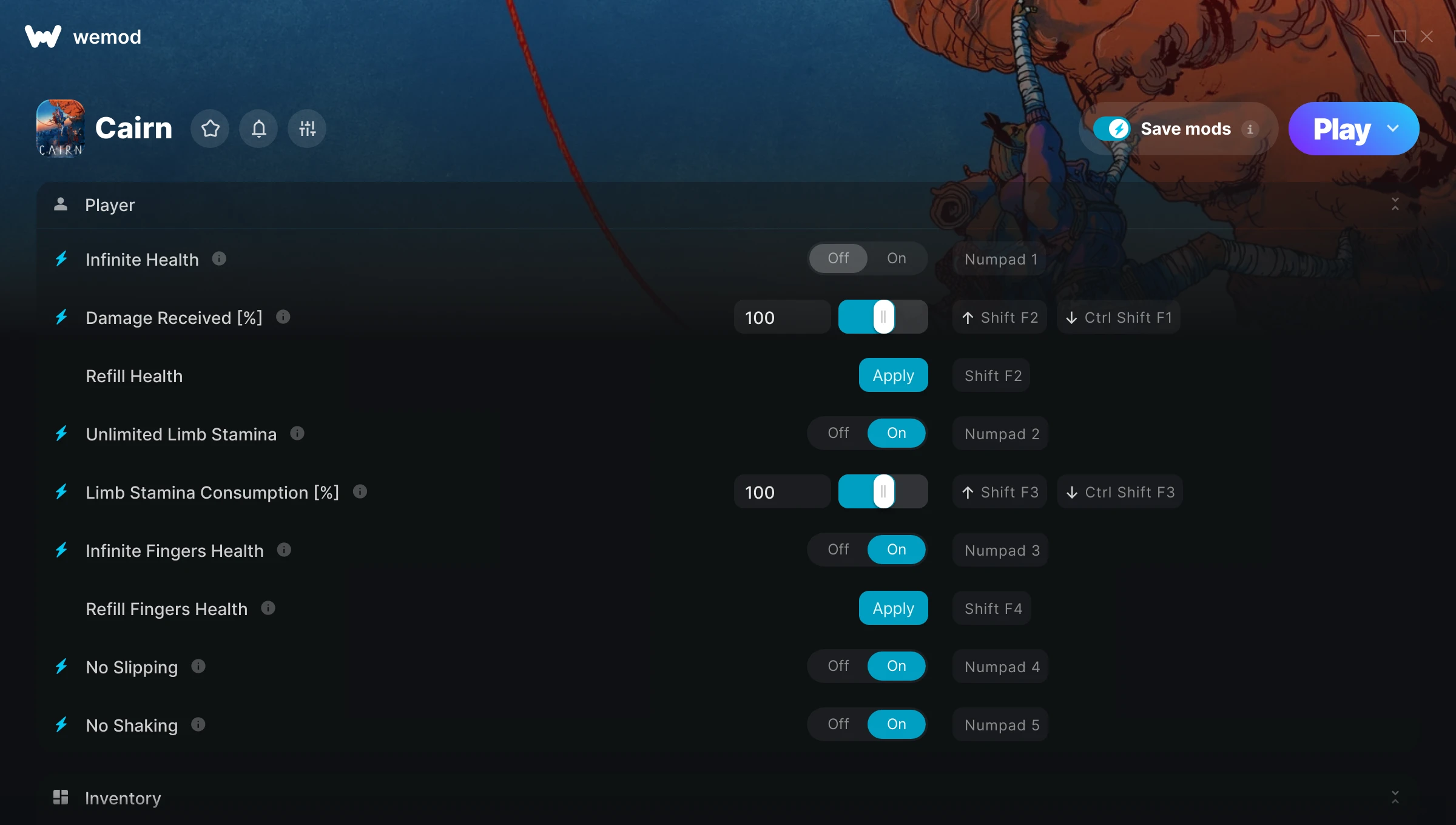 How do I use the cheats in Cairn?WeMod will safely display all of the games on your PC. Open a game from the list and simply press play. After the game loads and once you’re in-game, you can start enabling different cheats!Will this work with my game version?WeMod uses advanced technology to detect the game version you’re running and will let you know if it’s supported. If it’s not, you will still have the option of giving it a try or requesting an update!