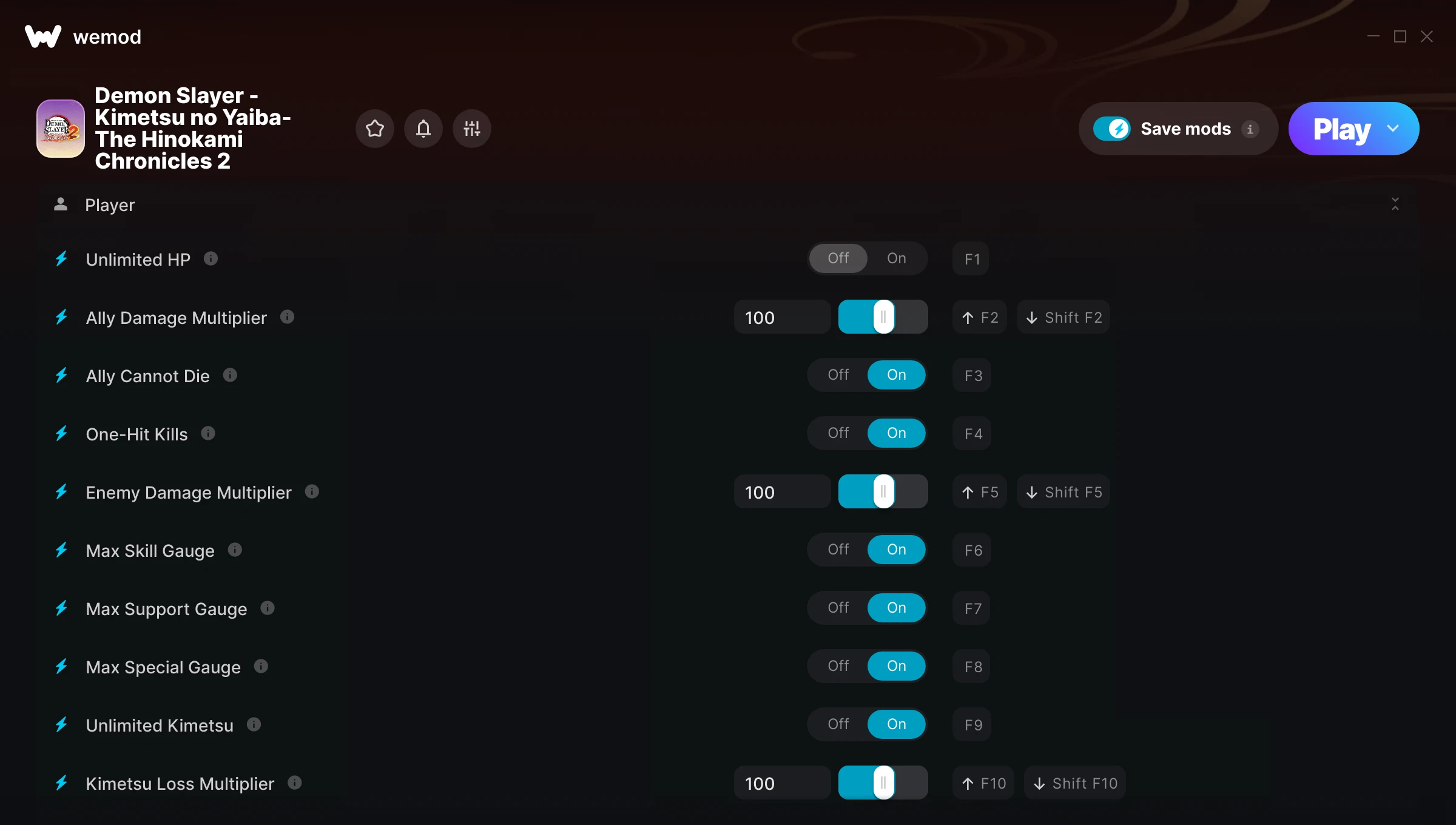 How do I use the cheats in Demon Slayer -Kimetsu no Yaiba- The Hinokami Chronicles 2?WeMod will safely display all of the games on your PC. Open a game from the list and simply press play. After the game loads and once you’re in-game, you can start enabling different cheats!Will this work with my game version?WeMod uses advanced technology to detect the game version you’re running and will let you know if it’s supported. If it’s not, you will still have the option of giving it a try or requesting an update!