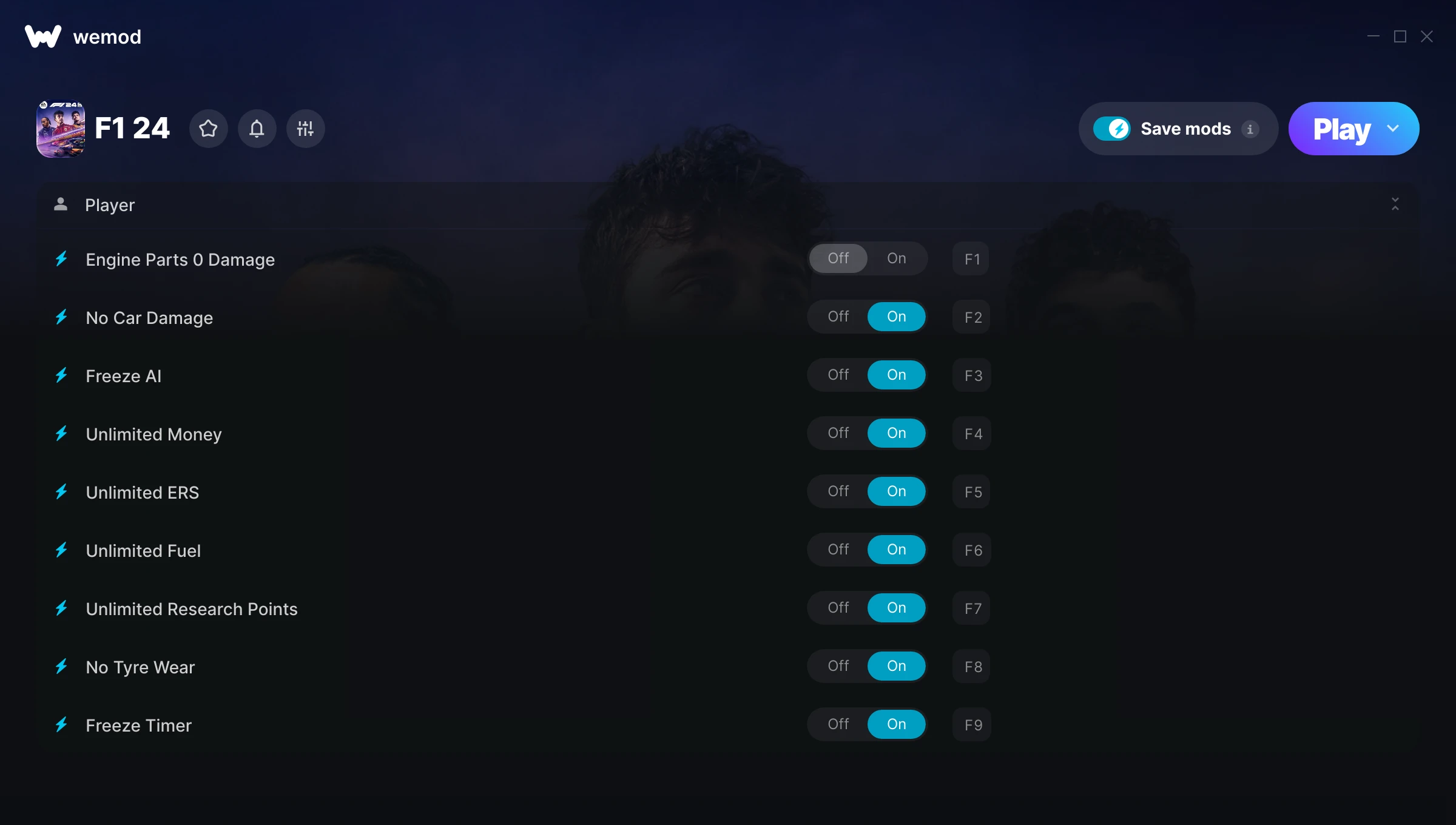 How do I use the cheats in F1 24?WeMod will safely display all of the games on your PC. Open a game from the list and simply press play. After the game loads and once you’re in-game, you can start enabling different cheats!Will this work with my game version?WeMod uses advanced technology to detect the game version you’re running and will let you know if it’s supported. If it’s not, you will still have the option of giving it a try or requesting an update!