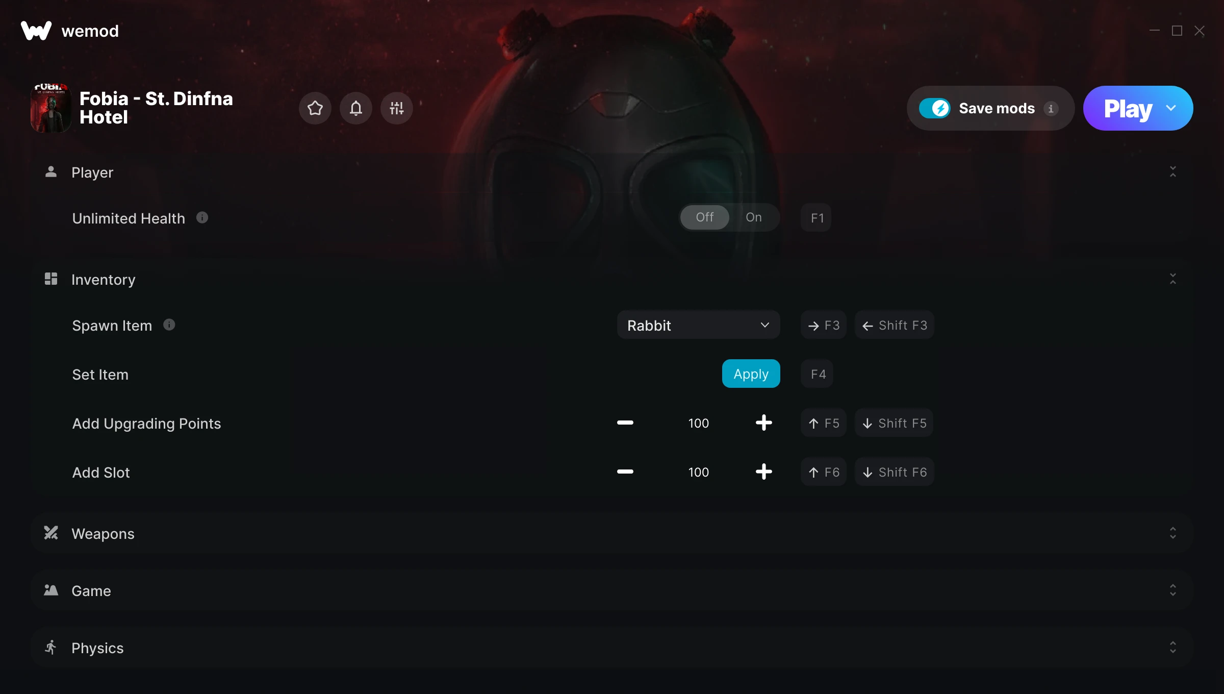 How do I use the cheats in Fobia - St. Dinfna Hotel?WeMod will safely display all of the games on your PC. Open a game from the list and simply press play. After the game loads and once you’re in-game, you can start enabling different cheats!Will this work with my game version?WeMod uses advanced technology to detect the game version you’re running and will let you know if it’s supported. If it’s not, you will still have the option of giving it a try or requesting an update!