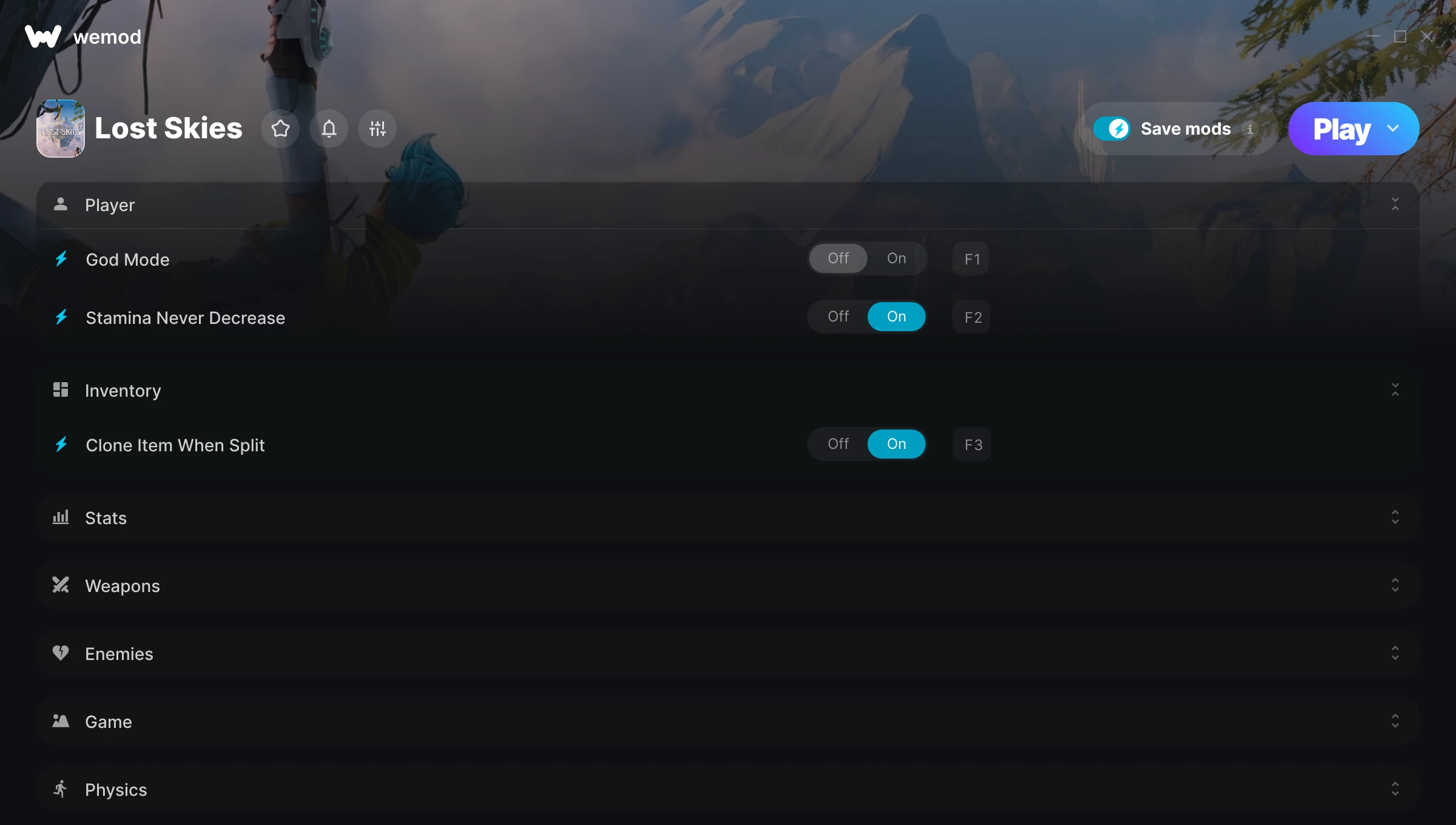 How do I use the cheats in Lost Skies?WeMod will safely display all of the games on your PC. Open a game from the list and simply press play. After the game loads and once you’re in-game, you can start enabling different cheats!Will this work with my game version?WeMod uses advanced technology to detect the game version you’re running and will let you know if it’s supported. If it’s not, you will still have the option of giving it a try or requesting an update!