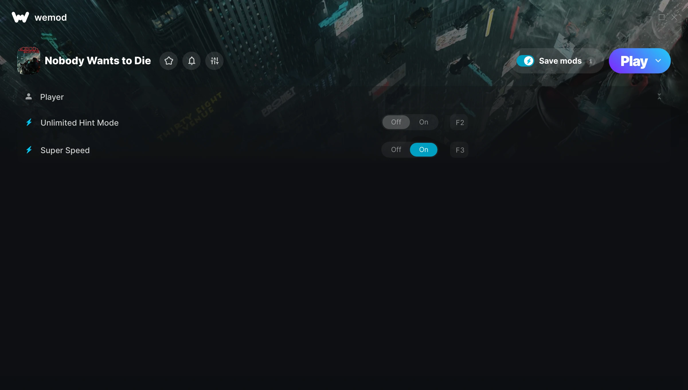 How do I use the cheats in Nobody Wants to Die?WeMod will safely display all of the games on your PC. Open a game from the list and simply press play. After the game loads and once you’re in-game, you can start enabling different cheats!Will this work with my game version?WeMod uses advanced technology to detect the game version you’re running and will let you know if it’s supported. If it’s not, you will still have the option of giving it a try or requesting an update!