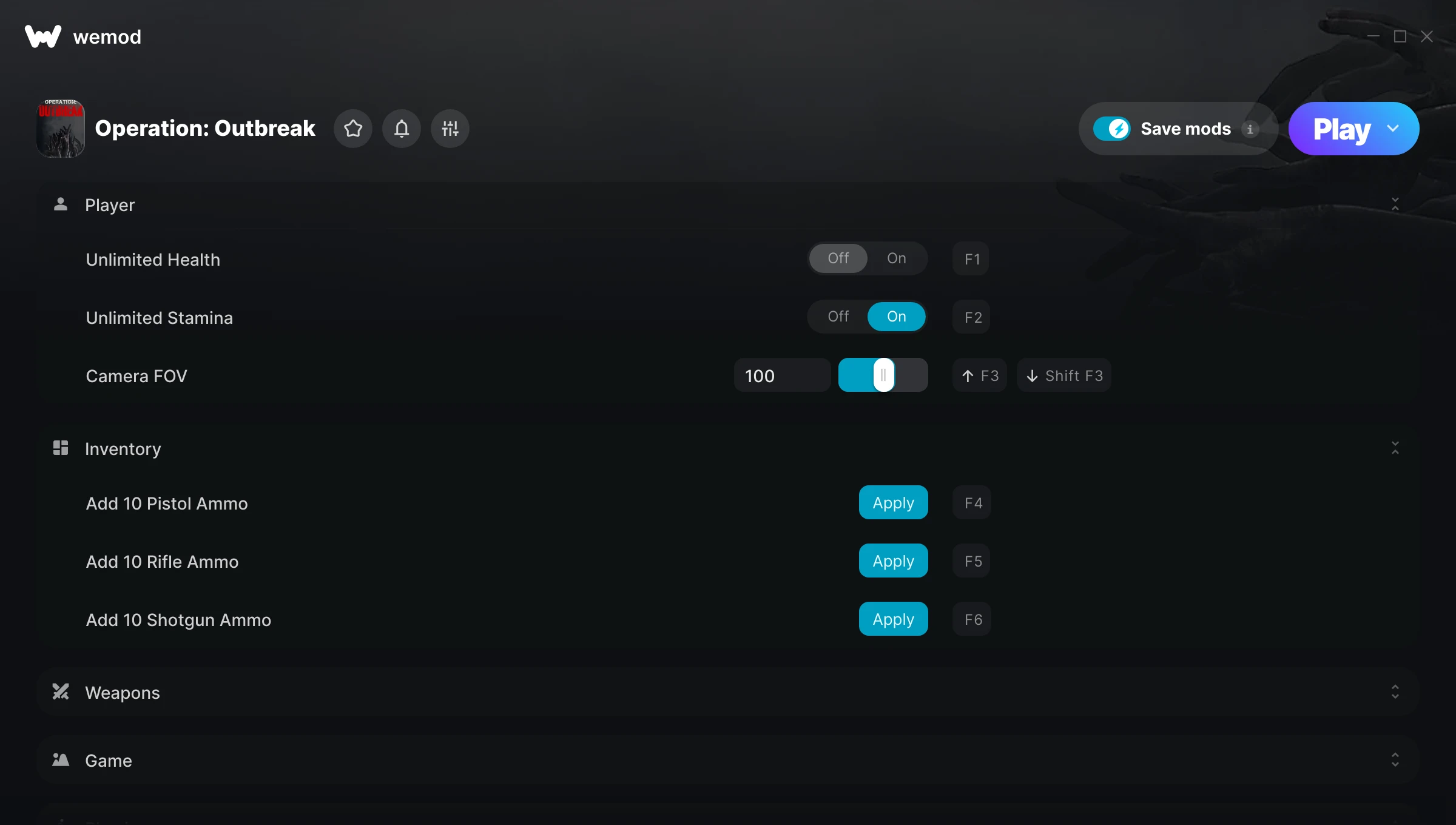 How do I use the cheats in Operation: Outbreak?WeMod will safely display all of the games on your PC. Open a game from the list and simply press play. After the game loads and once you’re in-game, you can start enabling different cheats!Will this work with my game version?WeMod uses advanced technology to detect the game version you’re running and will let you know if it’s supported. If it’s not, you will still have the option of giving it a try or requesting an update!