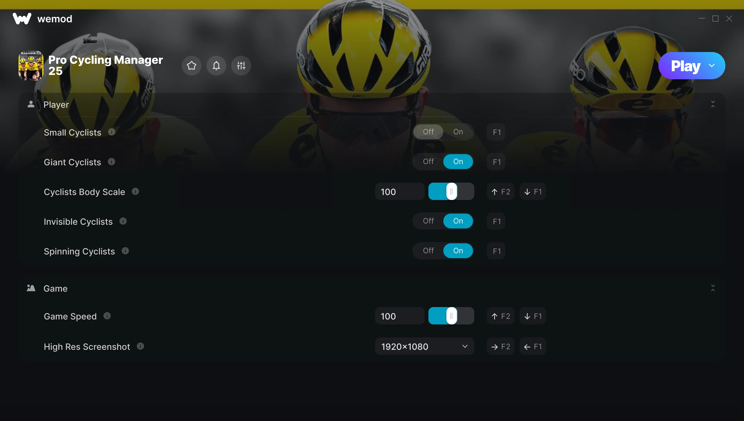 How do I use the cheats in Pro Cycling Manager 25?WeMod will safely display all of the games on your PC. Open a game from the list and simply press play. After the game loads and once you’re in-game, you can start enabling different cheats!Will this work with my game version?WeMod uses advanced technology to detect the game version you’re running and will let you know if it’s supported. If it’s not, you will still have the option of giving it a try or requesting an update!