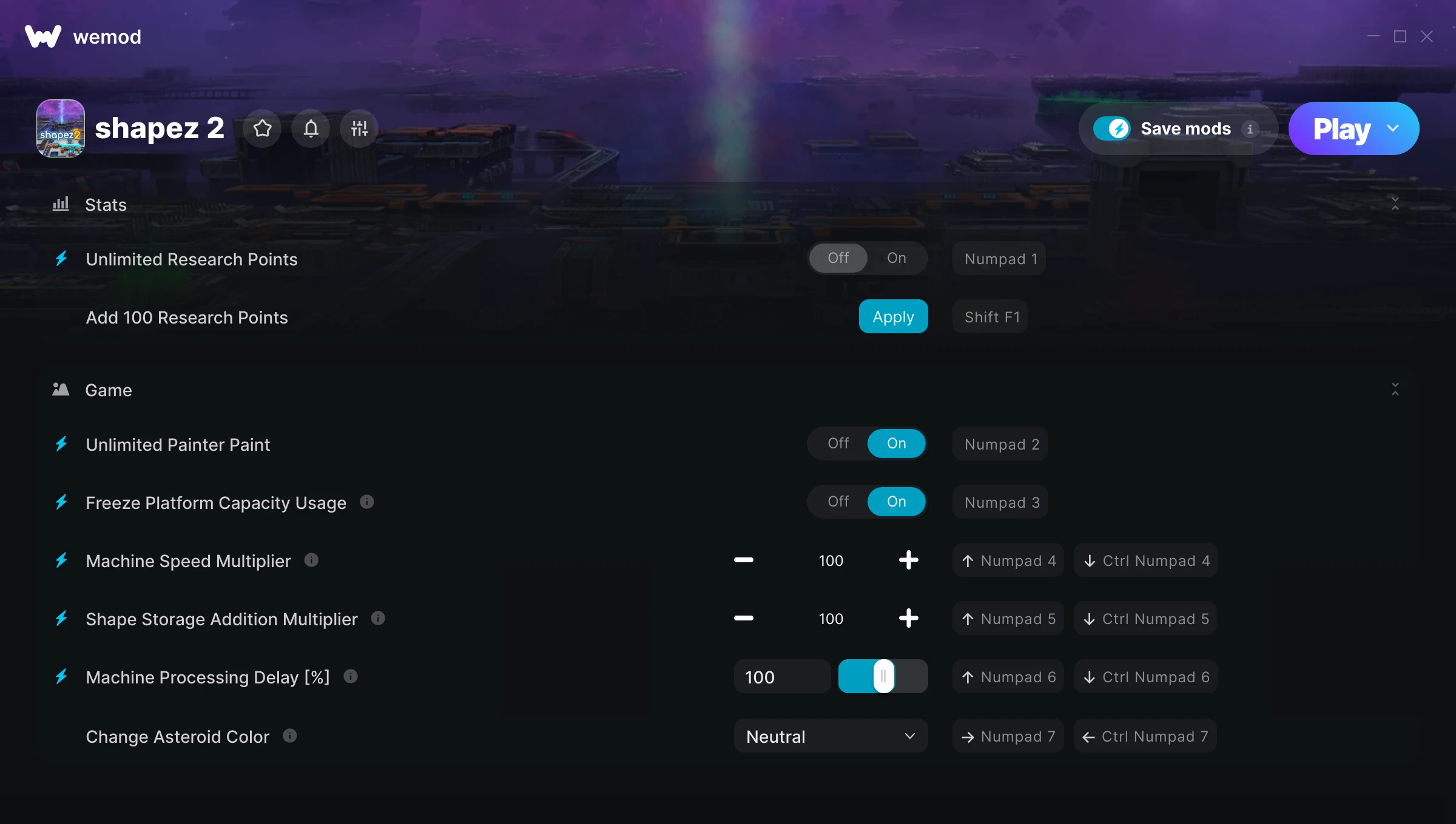 How do I use the cheats in shapez 2?WeMod will safely display all of the games on your PC. Open a game from the list and simply press play. After the game loads and once you’re in-game, you can start enabling different cheats!Will this work with my game version?WeMod uses advanced technology to detect the game version you’re running and will let you know if it’s supported. If it’s not, you will still have the option of giving it a try or requesting an update!