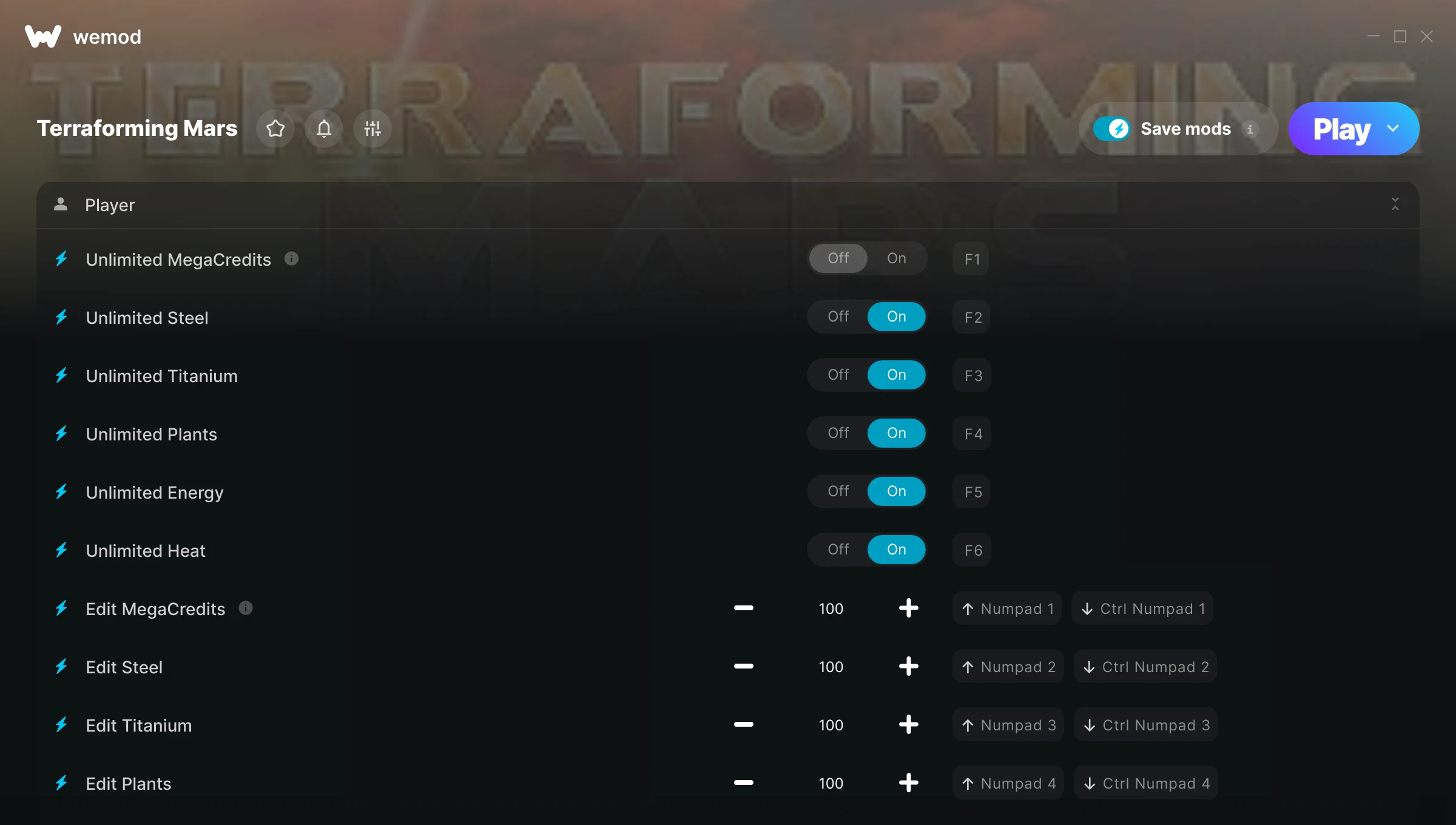 How do I use the cheats in Terraforming Mars?WeMod will safely display all of the games on your PC. Open a game from the list and simply press play. After the game loads and once you’re in-game, you can start enabling different cheats!Will this work with my game version?WeMod uses advanced technology to detect the game version you’re running and will let you know if it’s supported. If it’s not, you will still have the option of giving it a try or requesting an update!
