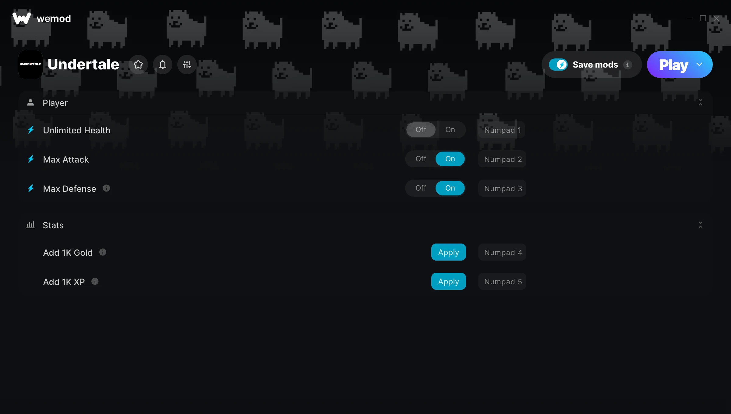 The unlimited health was so good, i was on my pacifist run then i went to core (i hacked undertale so i got true locket early) but the core enemies we're to strong and dealt 2-5 damage each hit, i pressed 1 and it was a no problemo!