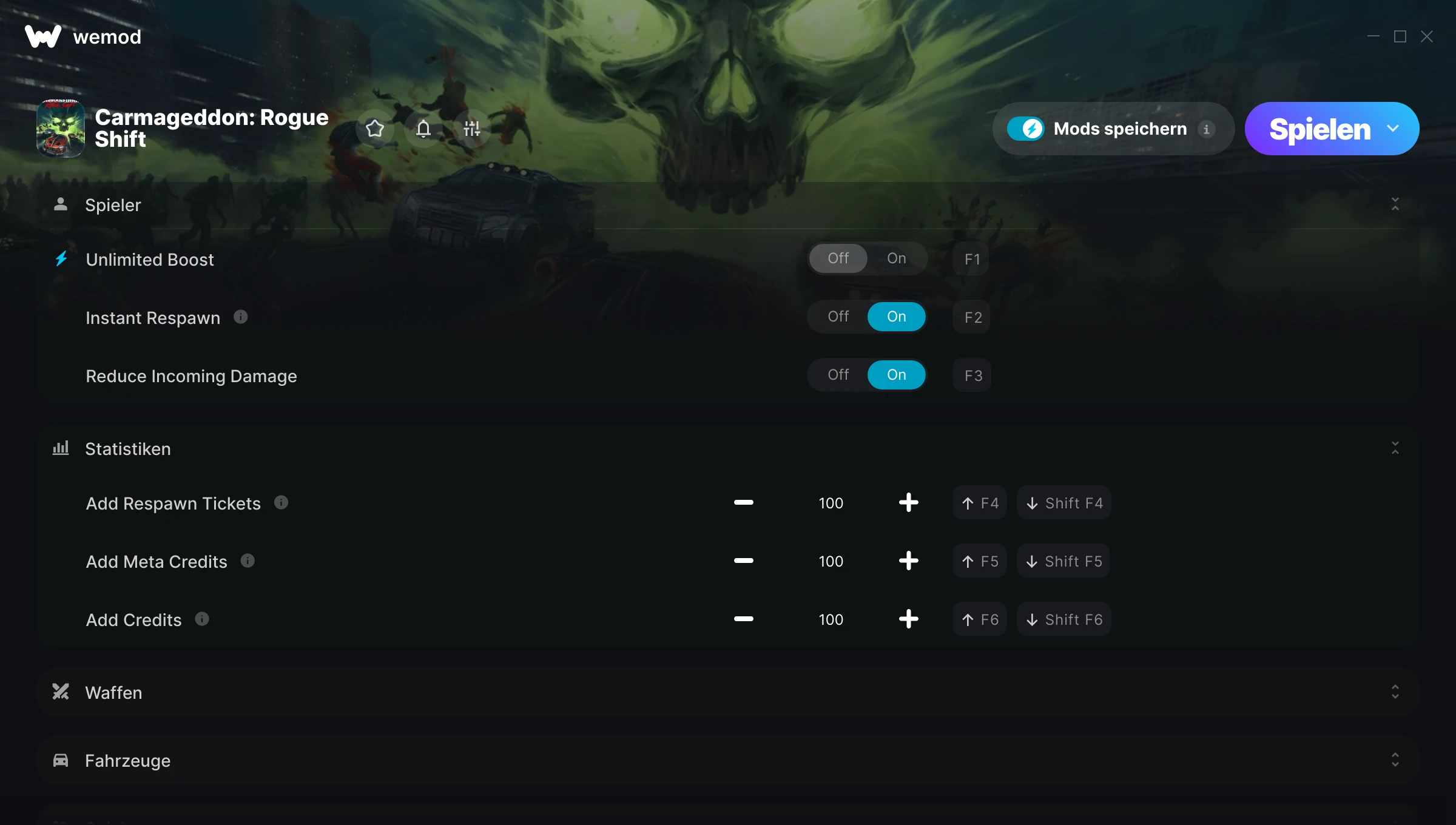 85MB Windows ...oder besuche uns auf deinem PC, um die App herunterzuladen Hole dir Unbegrenzter Boost, Sofortiger Respawn & 9 andere Mods for Carmageddon: Rogue Shift with WeMod