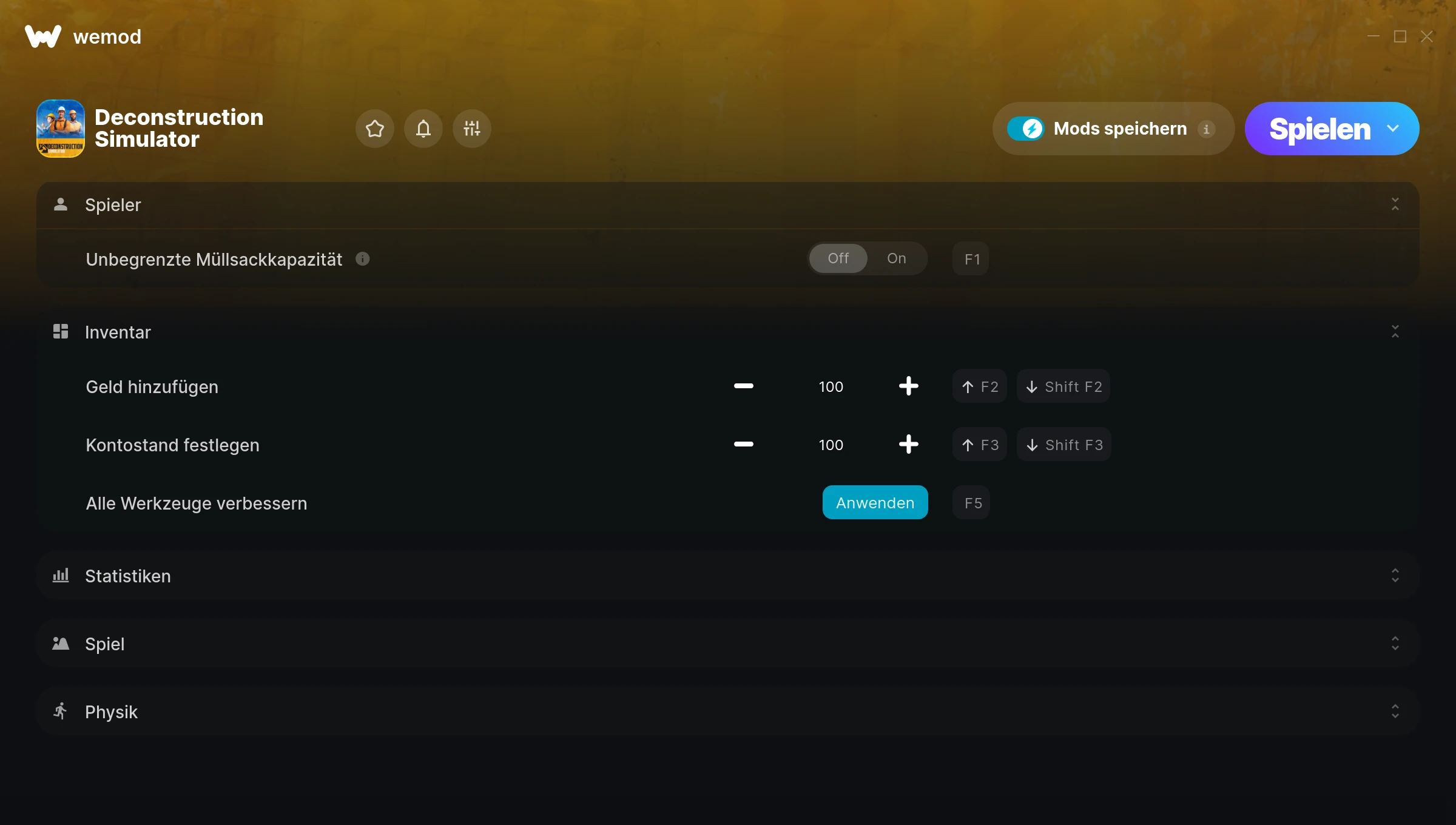 Erfahre mehrWeMod ist immer sicher und immer frei wegen unserer Gemeinschaft von Millionen von Spielern auf der ganzen Welt. Wir werden zu von WeMod Pro-Abonnenten unterstützt. Schau dir unsere Bewertungen auf Trustpilot an.