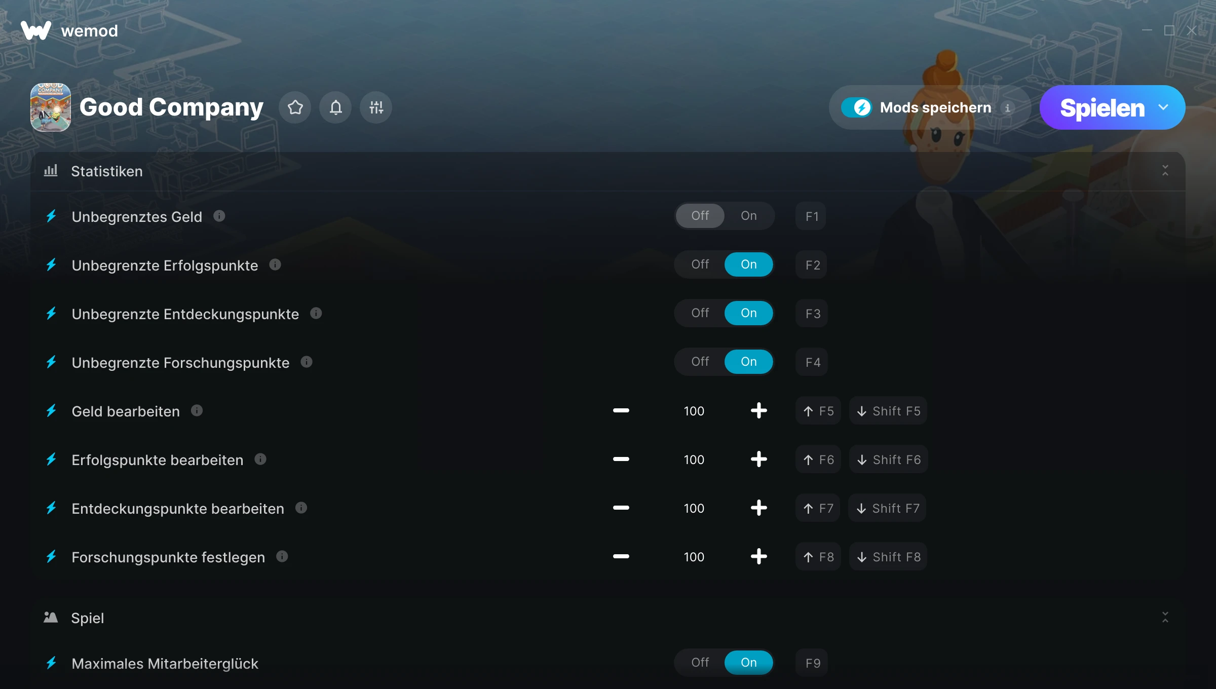 Erfahre mehrWeMod ist immer sicher und immer frei wegen unserer Gemeinschaft von Millionen von Spielern auf der ganzen Welt. Wir werden zu von WeMod Pro-Abonnenten unterstützt. Schau dir unsere Bewertungen auf Trustpilot an.