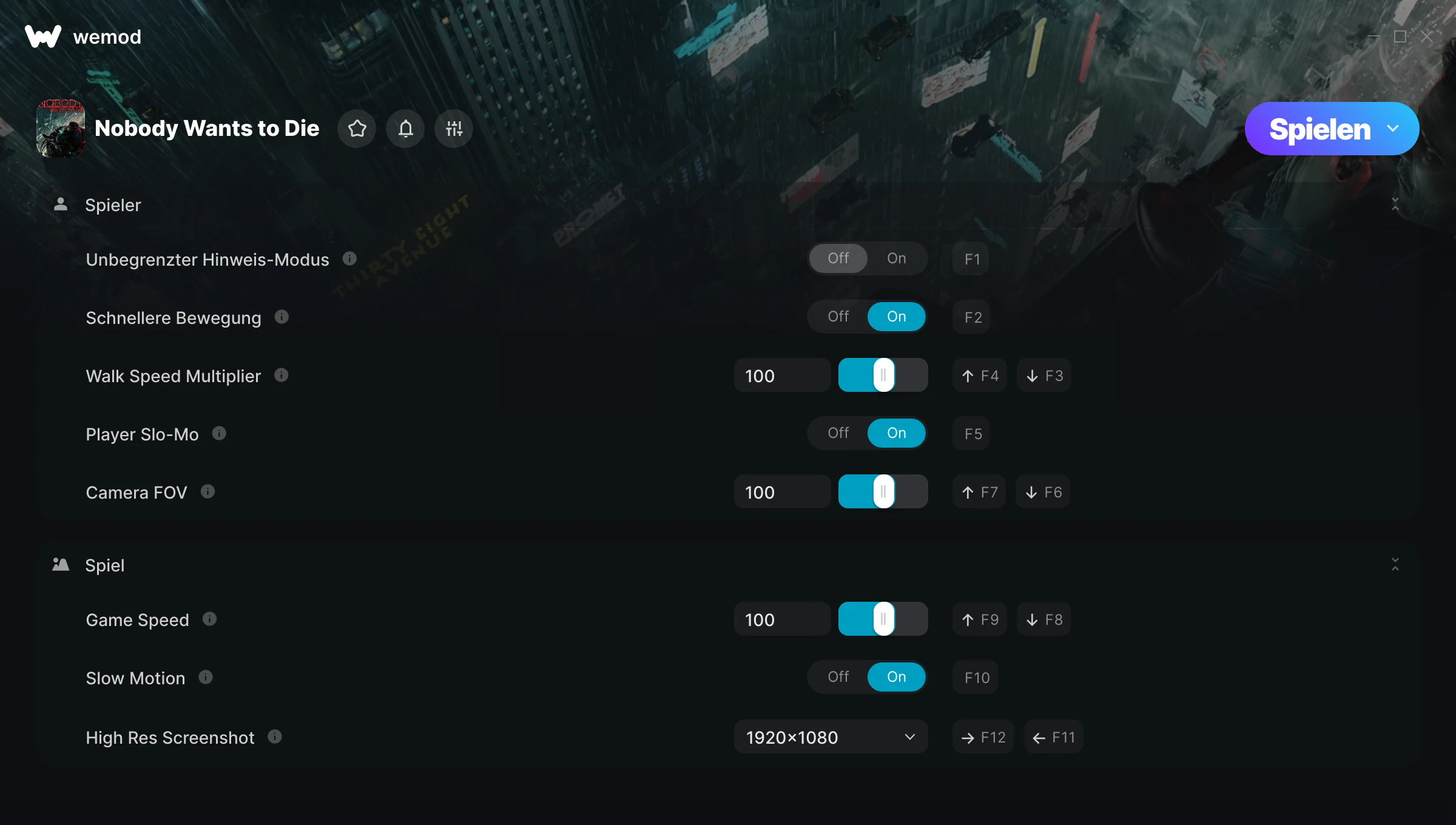 WeMod zeigt alle Spiele sicher auf deinem PC an. Öffne ein Spiel aus der Liste und drücke einfach auf die Spieltaste. Nach dem Spiel geladen wird und sobald du im Spiel bist, kannst du verschiedene Cheats aktivieren!