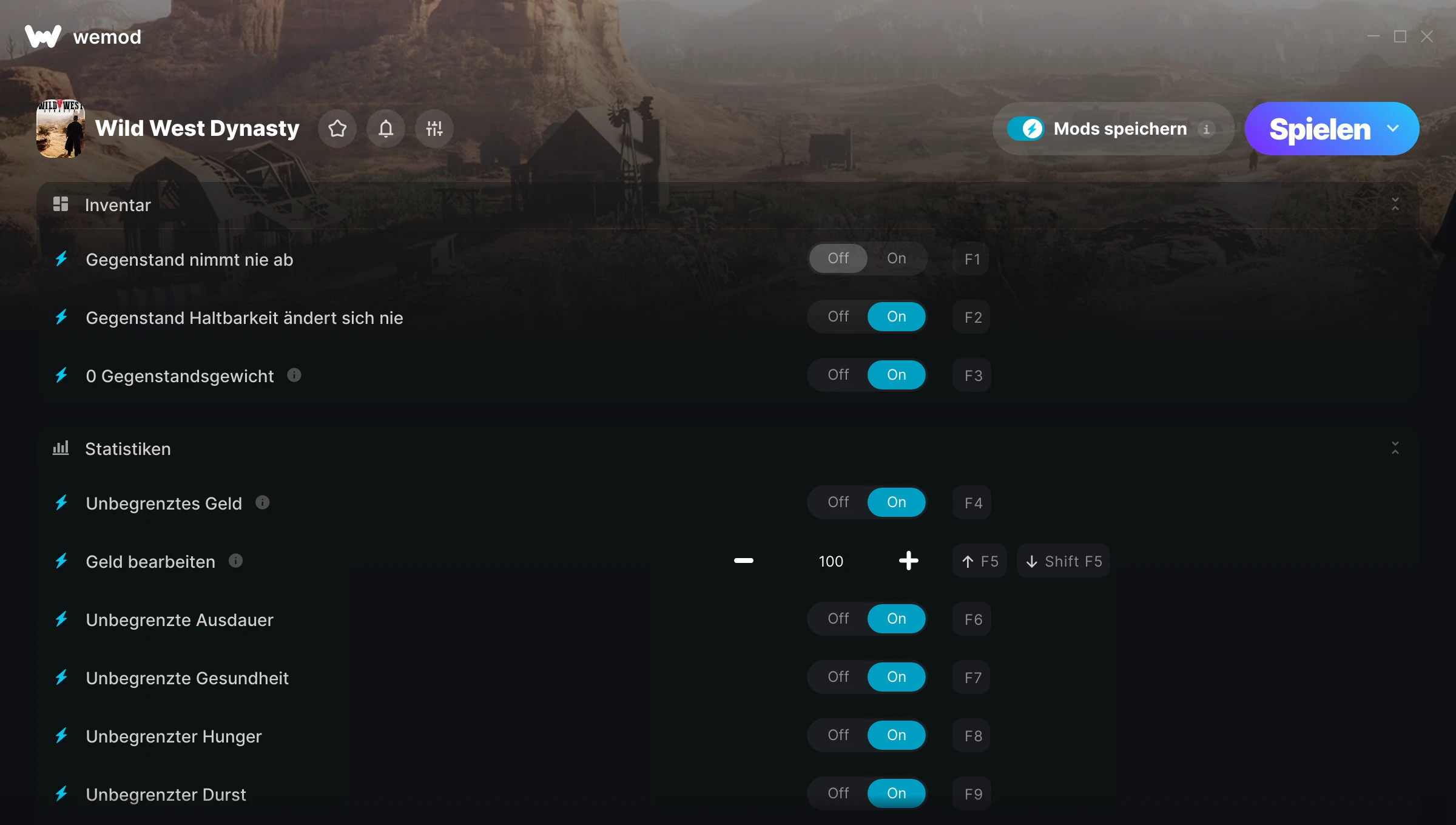 85MB Windows ...oder besuche uns auf deinem PC, um die App herunterzuladen Hole dir Gegenstand nimmt nie ab, Gegenstand Haltbarkeit ändert sich nie & 12 andere Mods for Wild West Legacy with WeMod