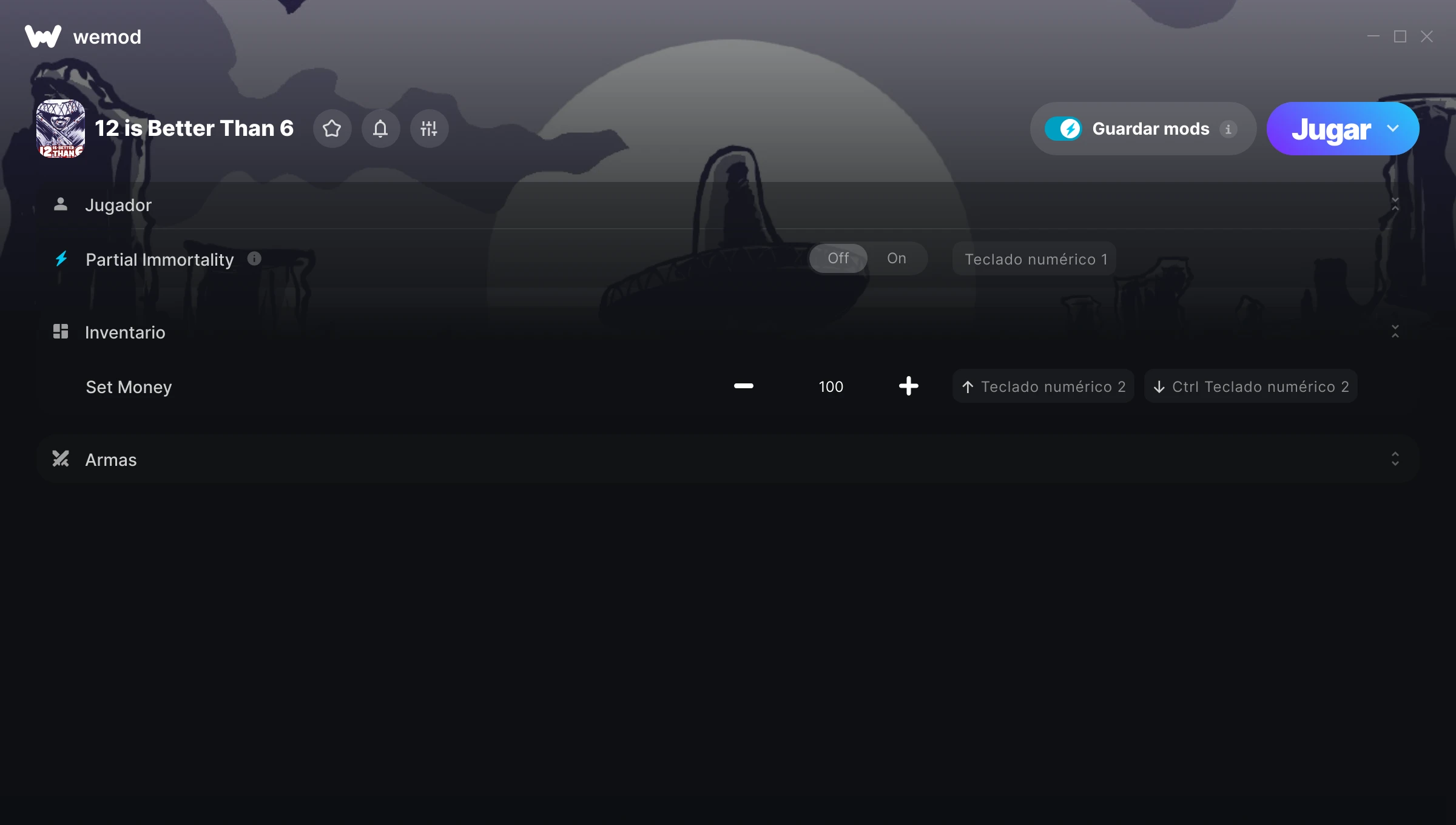 ¿Cómo puedo usar las trampas para 12 is Better Than 6?WeMod mostrará todos los juegos en tu PC de forma segura. Abre un juego de la lista y simplemente pulsa jugar. Cuando el juego se haya cargado y estés in-game, podrás empezar a activar las diferentes trampas.¿Funcionará esto con mi versión del juego?WeMod utiliza tecnología avanzada para detectar la versión del juego que tienes y te informará si es compatible. Si no es así, todavía tendrás la opción de probarlo o solicitar una actualización.