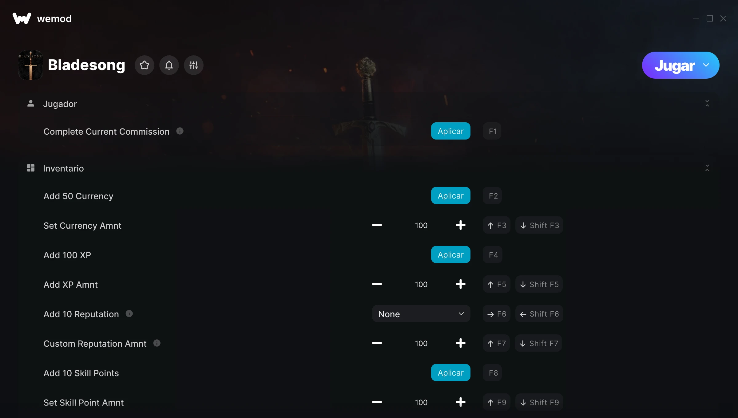 ¿Cómo puedo usar las trampas para Bladesong?WeMod mostrará todos los juegos en tu PC de forma segura. Abre un juego de la lista y simplemente pulsa jugar. Cuando el juego se haya cargado y estés in-game, podrás empezar a activar las diferentes trampas.¿Funcionará esto con mi versión del juego?WeMod utiliza tecnología avanzada para detectar la versión del juego que tienes y te informará si es compatible. Si no es así, todavía tendrás la opción de probarlo o solicitar una actualización.