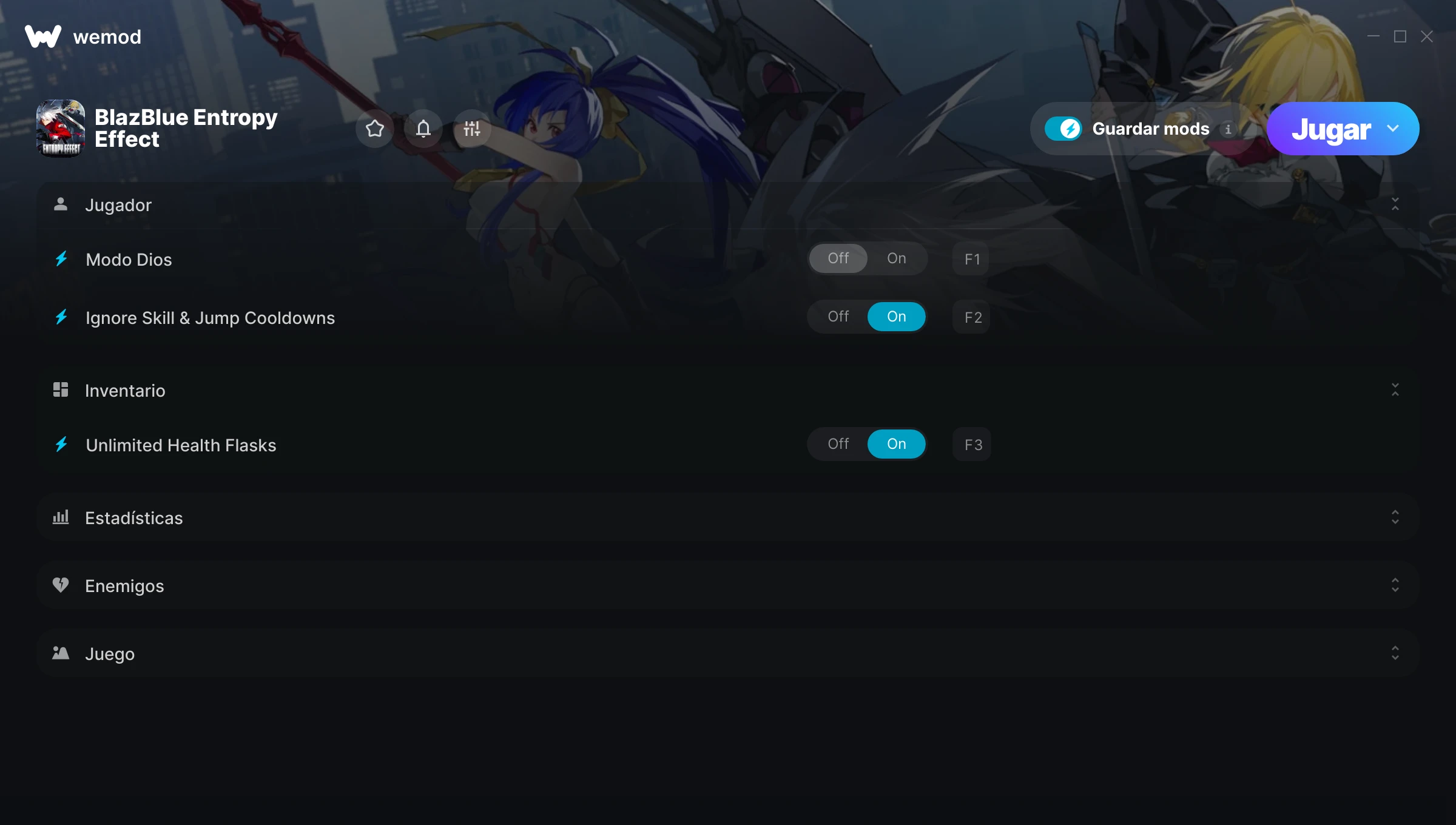 85MB Windows ...o visítanos en tu PC para descargar la aplicación Obtener Modo Dios, Ignorar enfriamientos de habilidades y saltos & 5 otros mods for BlazBlue Entropy Effect with WeMod
