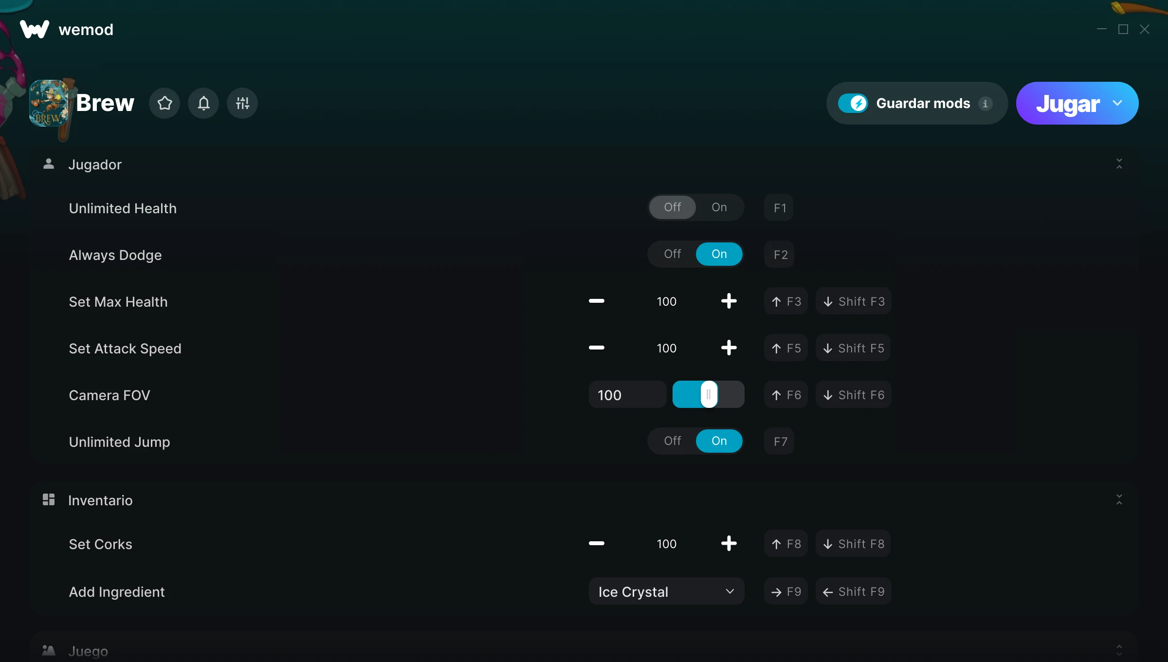 ¿Cómo puedo usar las trampas para Brew?WeMod mostrará todos los juegos en tu PC de forma segura. Abre un juego de la lista y simplemente pulsa jugar. Cuando el juego se haya cargado y estés in-game, podrás empezar a activar las diferentes trampas.¿Funcionará esto con mi versión del juego?WeMod utiliza tecnología avanzada para detectar la versión del juego que tienes y te informará si es compatible. Si no es así, todavía tendrás la opción de probarlo o solicitar una actualización.