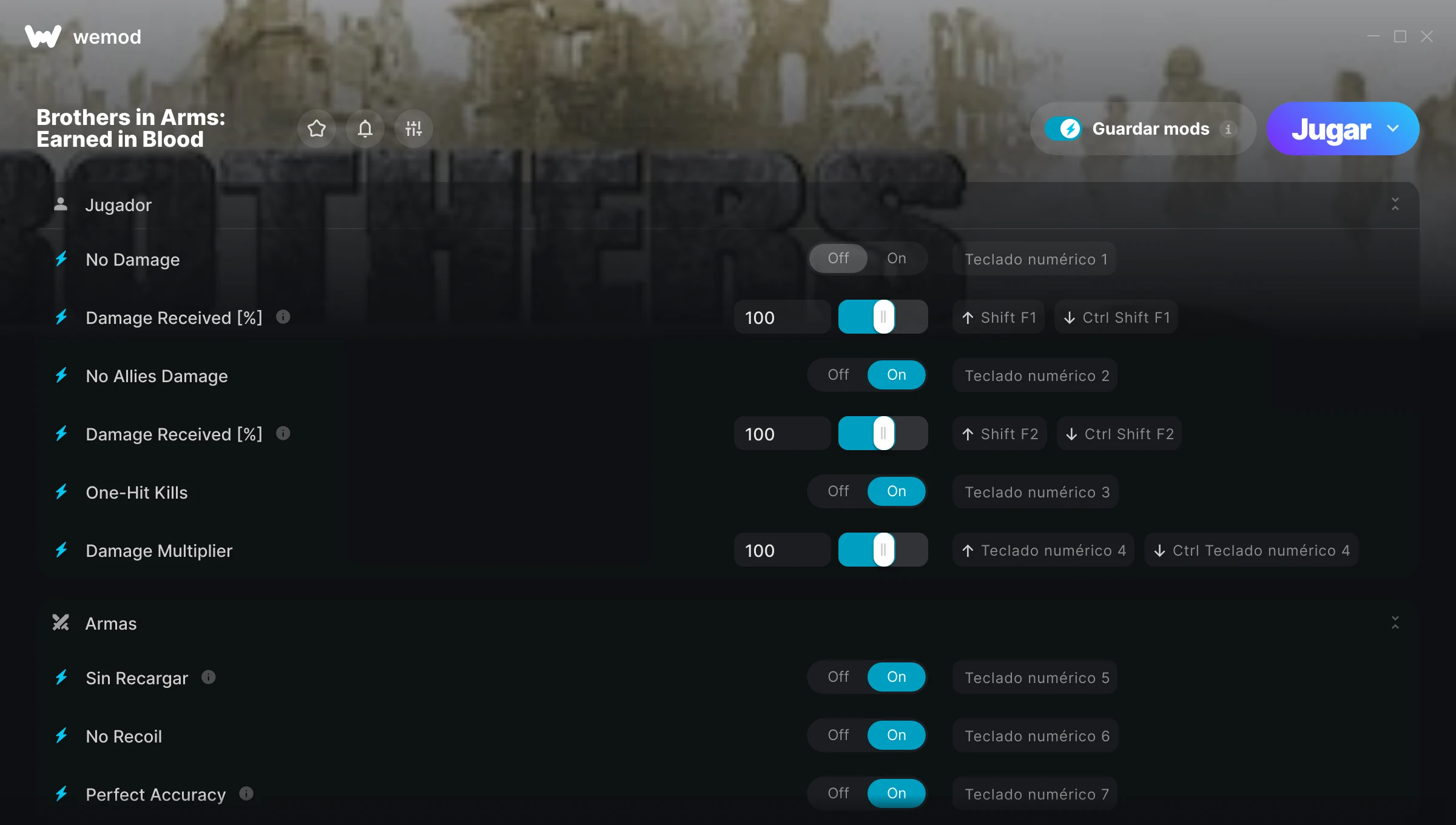 ¿Cómo puedo usar las trampas para Brothers in Arms: Earned in Blood?WeMod mostrará todos los juegos en tu PC de forma segura. Abre un juego de la lista y simplemente pulsa jugar. Cuando el juego se haya cargado y estés in-game, podrás empezar a activar las diferentes trampas.¿Funcionará esto con mi versión del juego?WeMod utiliza tecnología avanzada para detectar la versión del juego que tienes y te informará si es compatible. Si no es así, todavía tendrás la opción de probarlo o solicitar una actualización.
