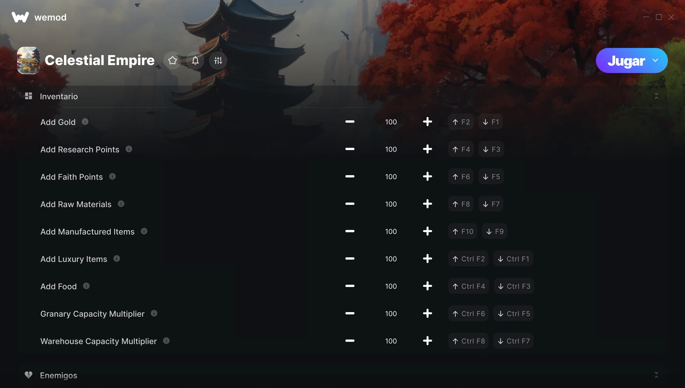 ¿Cómo puedo usar las trampas para Celestial Empire?WeMod mostrará todos los juegos en tu PC de forma segura. Abre un juego de la lista y simplemente pulsa jugar. Cuando el juego se haya cargado y estés in-game, podrás empezar a activar las diferentes trampas.¿Funcionará esto con mi versión del juego?WeMod utiliza tecnología avanzada para detectar la versión del juego que tienes y te informará si es compatible. Si no es así, todavía tendrás la opción de probarlo o solicitar una actualización.