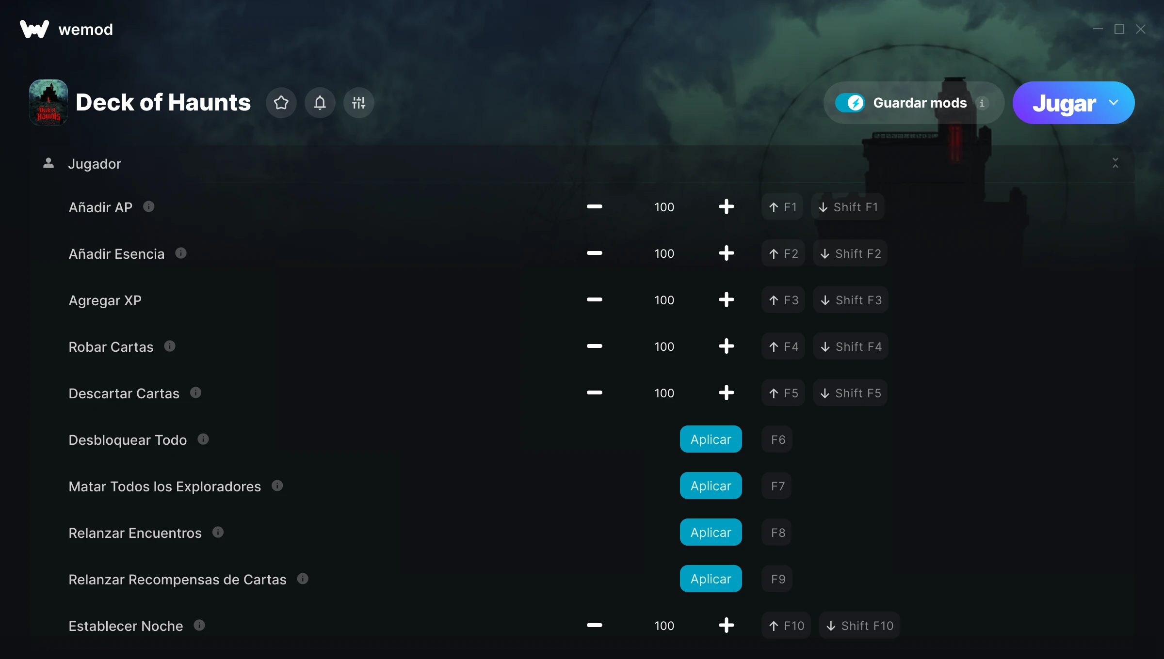 ¿Cómo puedo usar las trampas para Deck of Haunts?WeMod mostrará todos los juegos en tu PC de forma segura. Abre un juego de la lista y simplemente pulsa jugar. Cuando el juego se haya cargado y estés in-game, podrás empezar a activar las diferentes trampas.¿Funcionará esto con mi versión del juego?WeMod utiliza tecnología avanzada para detectar la versión del juego que tienes y te informará si es compatible. Si no es así, todavía tendrás la opción de probarlo o solicitar una actualización.