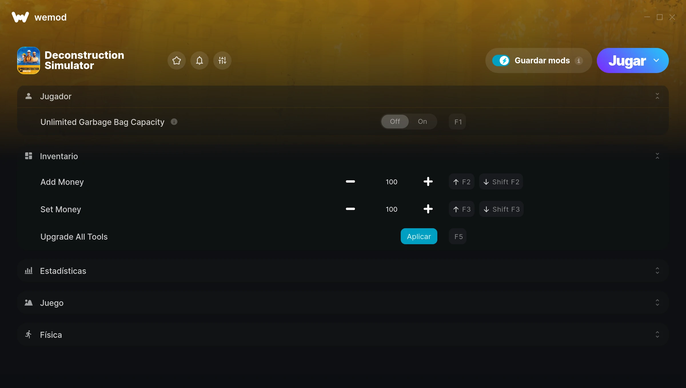 ¿Cómo puedo usar las trampas para Deconstruction Simulator?WeMod mostrará todos los juegos en tu PC de forma segura. Abre un juego de la lista y simplemente pulsa jugar. Cuando el juego se haya cargado y estés in-game, podrás empezar a activar las diferentes trampas.¿Funcionará esto con mi versión del juego?WeMod utiliza tecnología avanzada para detectar la versión del juego que tienes y te informará si es compatible. Si no es así, todavía tendrás la opción de probarlo o solicitar una actualización.
