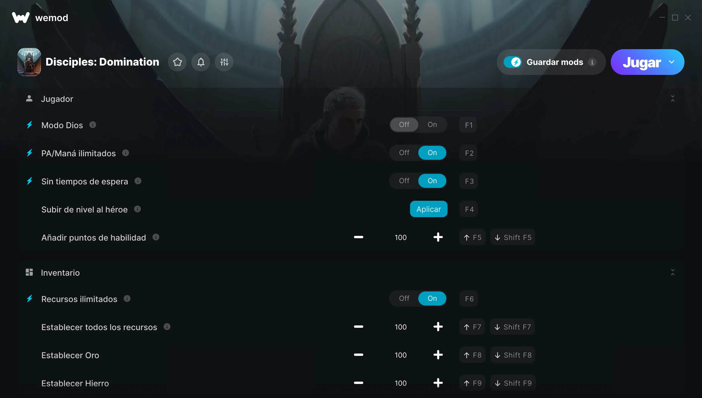 ¿Cómo puedo usar las trampas para Disciples: Domination?WeMod mostrará todos los juegos en tu PC de forma segura. Abre un juego de la lista y simplemente pulsa jugar. Cuando el juego se haya cargado y estés in-game, podrás empezar a activar las diferentes trampas.¿Funcionará esto con mi versión del juego?WeMod utiliza tecnología avanzada para detectar la versión del juego que tienes y te informará si es compatible. Si no es así, todavía tendrás la opción de probarlo o solicitar una actualización.