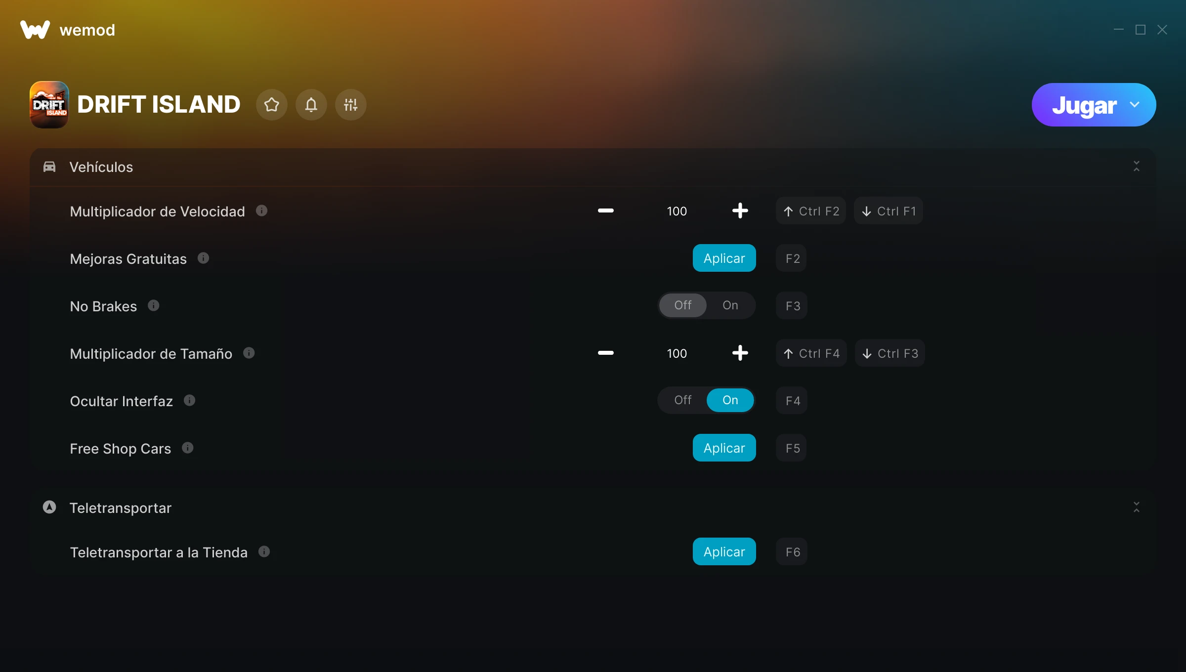 ¿Cómo puedo usar las trampas para DRIFT ISLAND?WeMod mostrará todos los juegos en tu PC de forma segura. Abre un juego de la lista y simplemente pulsa jugar. Cuando el juego se haya cargado y estés in-game, podrás empezar a activar las diferentes trampas.¿Funcionará esto con mi versión del juego?WeMod utiliza tecnología avanzada para detectar la versión del juego que tienes y te informará si es compatible. Si no es así, todavía tendrás la opción de probarlo o solicitar una actualización.