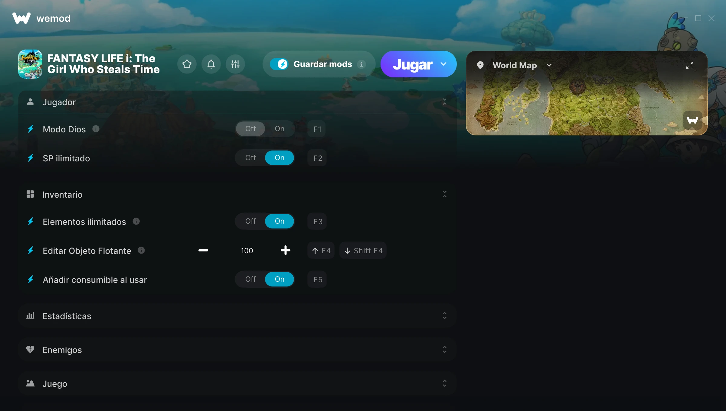 Activado Desactivado Salud ilimitada Energía ilimitada Alternar Mods