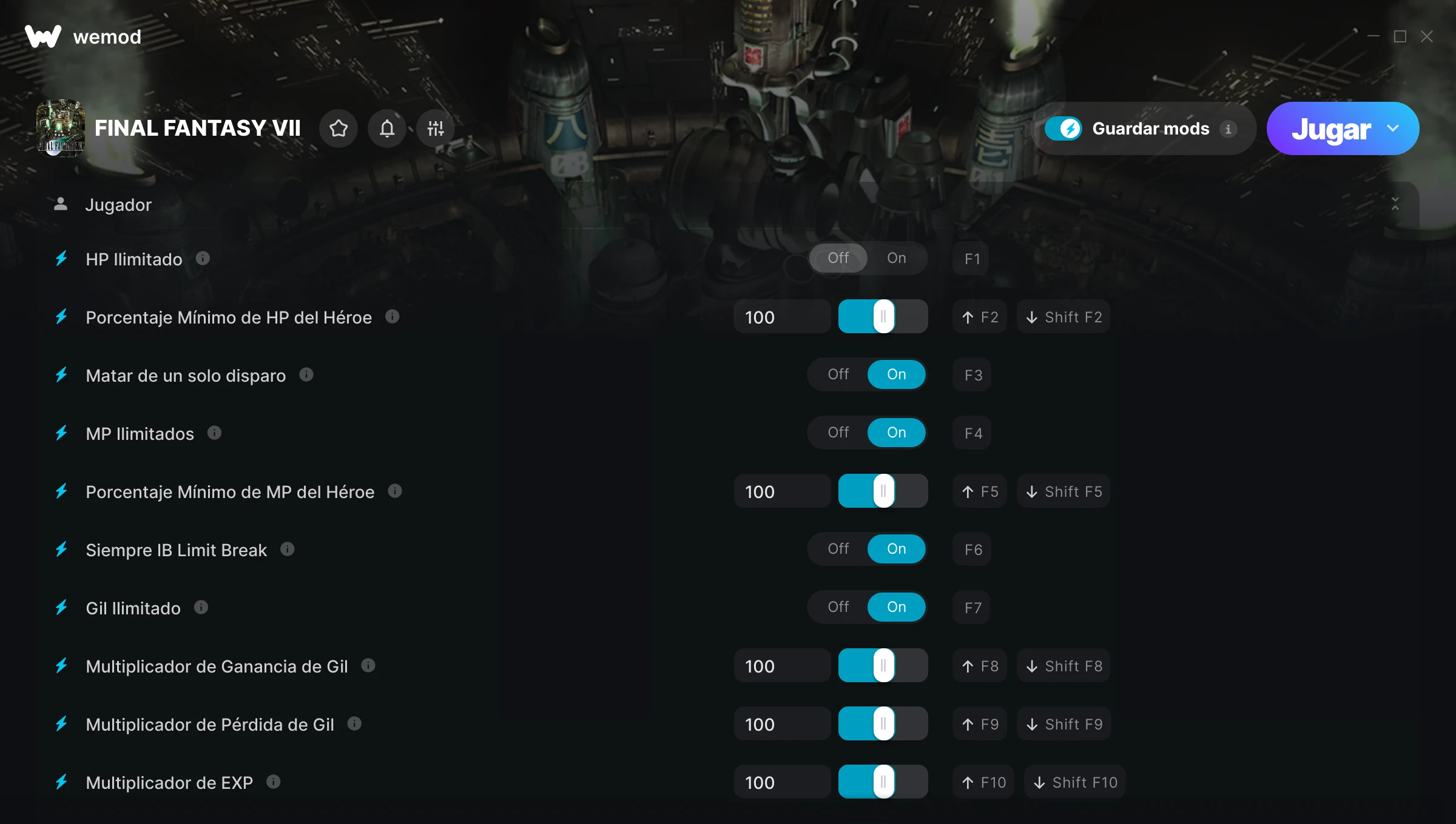 ¿Cómo puedo usar las trampas para FINAL FANTASY VII?WeMod mostrará todos los juegos en tu PC de forma segura. Abre un juego de la lista y simplemente pulsa jugar. Cuando el juego se haya cargado y estés in-game, podrás empezar a activar las diferentes trampas.¿Funcionará esto con mi versión del juego?WeMod utiliza tecnología avanzada para detectar la versión del juego que tienes y te informará si es compatible. Si no es así, todavía tendrás la opción de probarlo o solicitar una actualización.