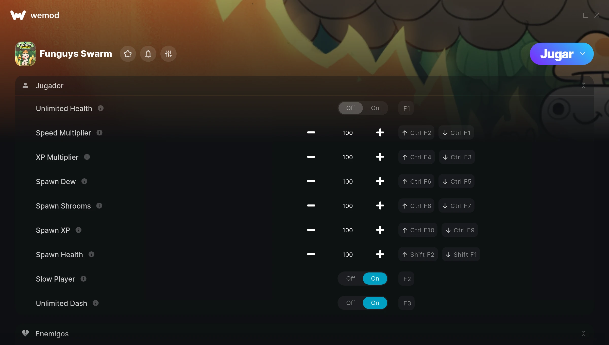 ¿Cómo puedo usar las trampas para Funguys Swarm?WeMod mostrará todos los juegos en tu PC de forma segura. Abre un juego de la lista y simplemente pulsa jugar. Cuando el juego se haya cargado y estés in-game, podrás empezar a activar las diferentes trampas.¿Funcionará esto con mi versión del juego?WeMod utiliza tecnología avanzada para detectar la versión del juego que tienes y te informará si es compatible. Si no es así, todavía tendrás la opción de probarlo o solicitar una actualización.