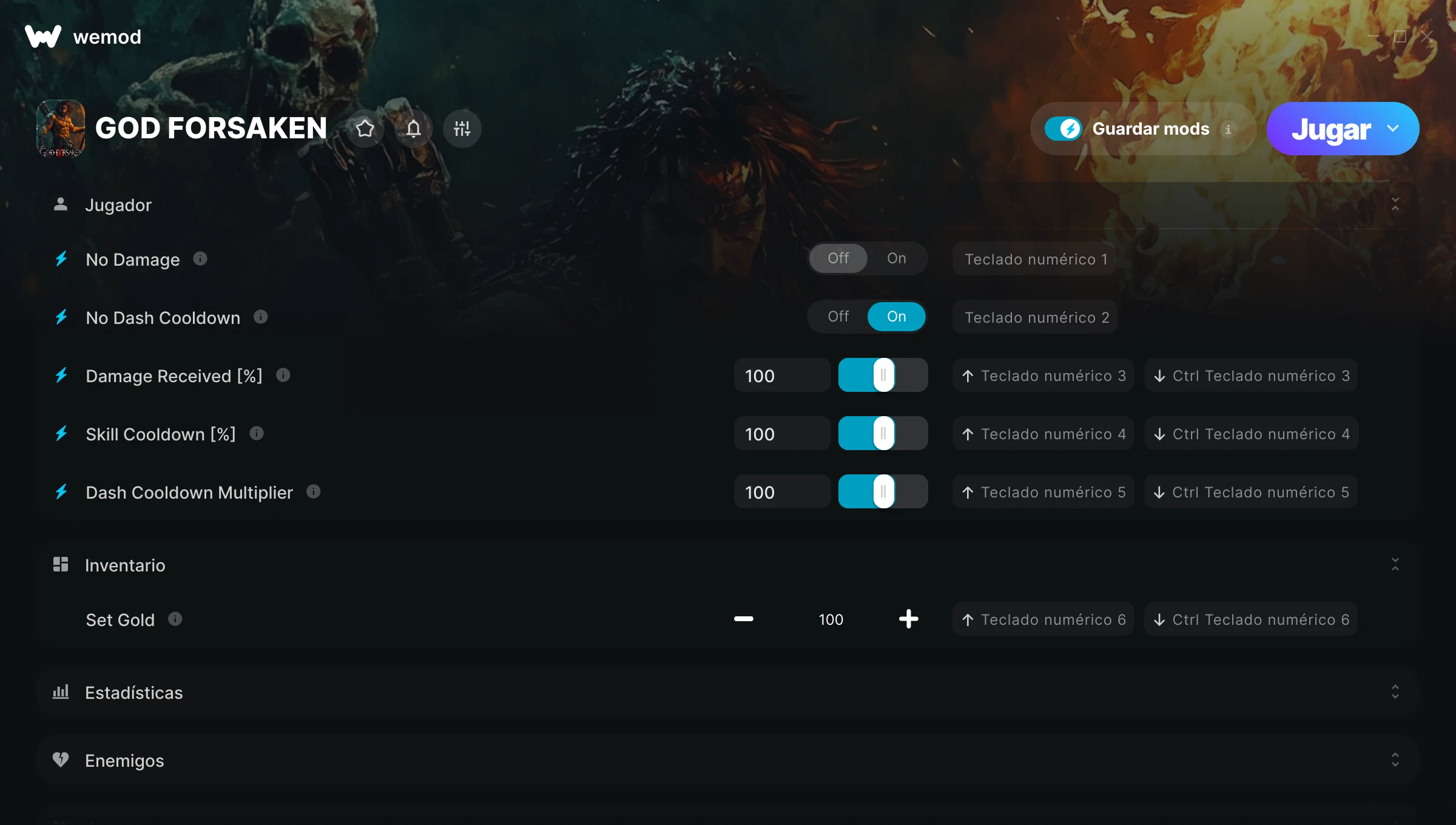 ¿Cómo puedo usar las trampas para GOD FORSAKEN?WeMod mostrará todos los juegos en tu PC de forma segura. Abre un juego de la lista y simplemente pulsa jugar. Cuando el juego se haya cargado y estés in-game, podrás empezar a activar las diferentes trampas.¿Funcionará esto con mi versión del juego?WeMod utiliza tecnología avanzada para detectar la versión del juego que tienes y te informará si es compatible. Si no es así, todavía tendrás la opción de probarlo o solicitar una actualización.