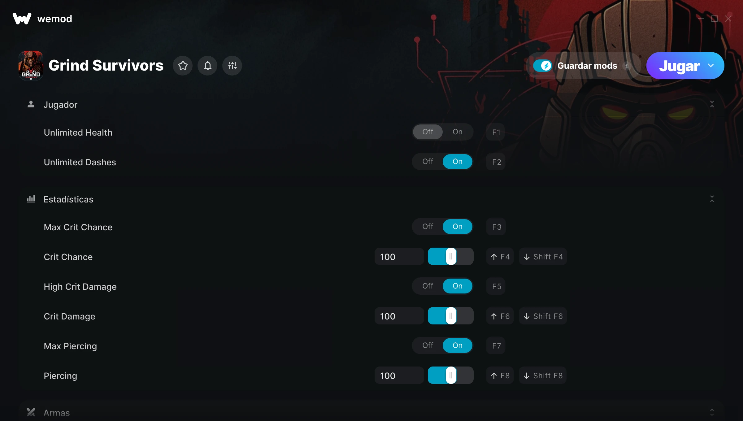 ¿Cómo puedo usar las trampas para Grind Survivors?WeMod mostrará todos los juegos en tu PC de forma segura. Abre un juego de la lista y simplemente pulsa jugar. Cuando el juego se haya cargado y estés in-game, podrás empezar a activar las diferentes trampas.¿Funcionará esto con mi versión del juego?WeMod utiliza tecnología avanzada para detectar la versión del juego que tienes y te informará si es compatible. Si no es así, todavía tendrás la opción de probarlo o solicitar una actualización.