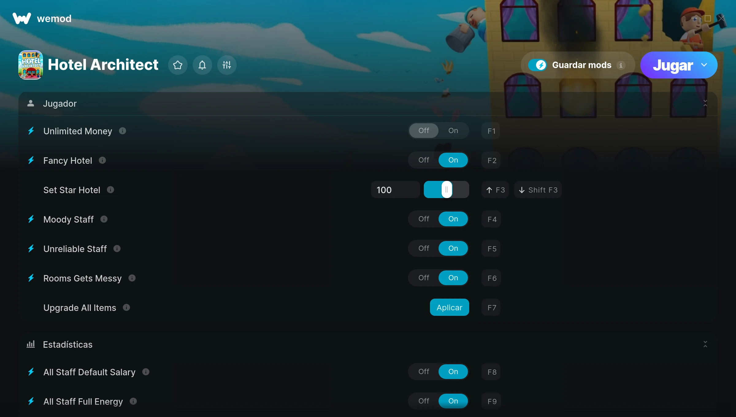 ¿Cómo puedo usar las trampas para Hotel Architect?WeMod mostrará todos los juegos en tu PC de forma segura. Abre un juego de la lista y simplemente pulsa jugar. Cuando el juego se haya cargado y estés in-game, podrás empezar a activar las diferentes trampas.¿Funcionará esto con mi versión del juego?WeMod utiliza tecnología avanzada para detectar la versión del juego que tienes y te informará si es compatible. Si no es así, todavía tendrás la opción de probarlo o solicitar una actualización.