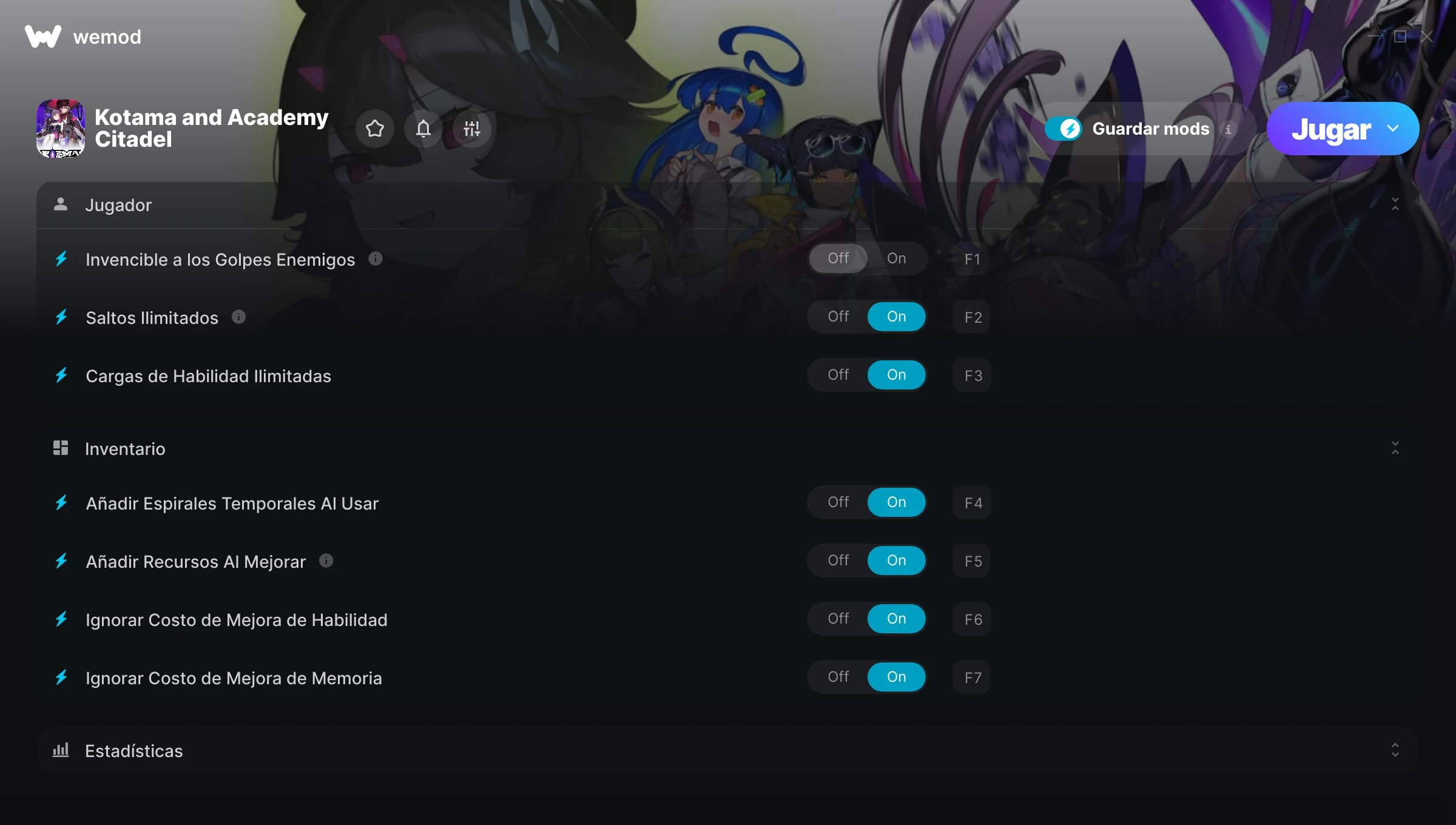 Activado Desactivado Salud ilimitada Energía ilimitada Alternar Mods