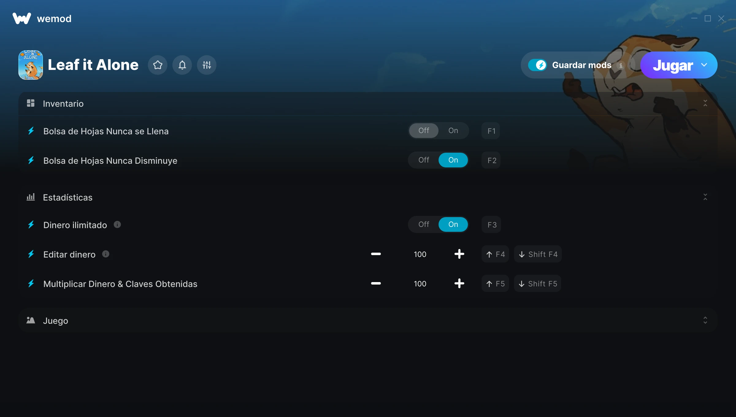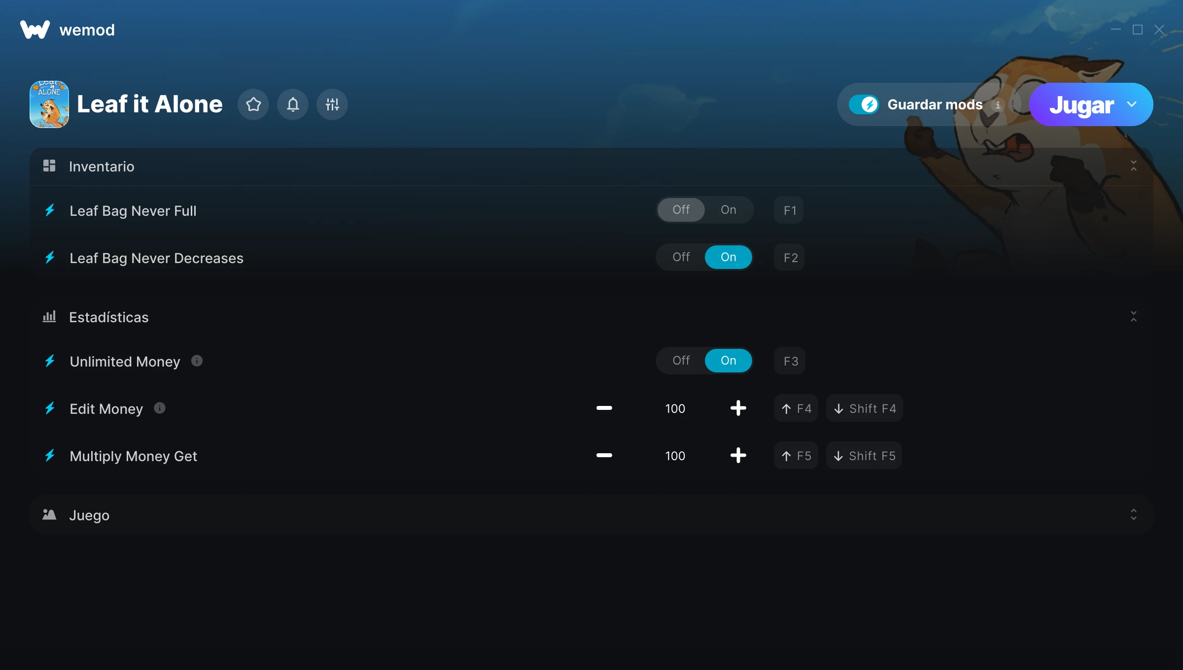 ¿Cómo puedo usar las trampas para Leaf it Alone?WeMod mostrará todos los juegos en tu PC de forma segura. Abre un juego de la lista y simplemente pulsa jugar. Cuando el juego se haya cargado y estés in-game, podrás empezar a activar las diferentes trampas.¿Funcionará esto con mi versión del juego?WeMod utiliza tecnología avanzada para detectar la versión del juego que tienes y te informará si es compatible. Si no es así, todavía tendrás la opción de probarlo o solicitar una actualización.