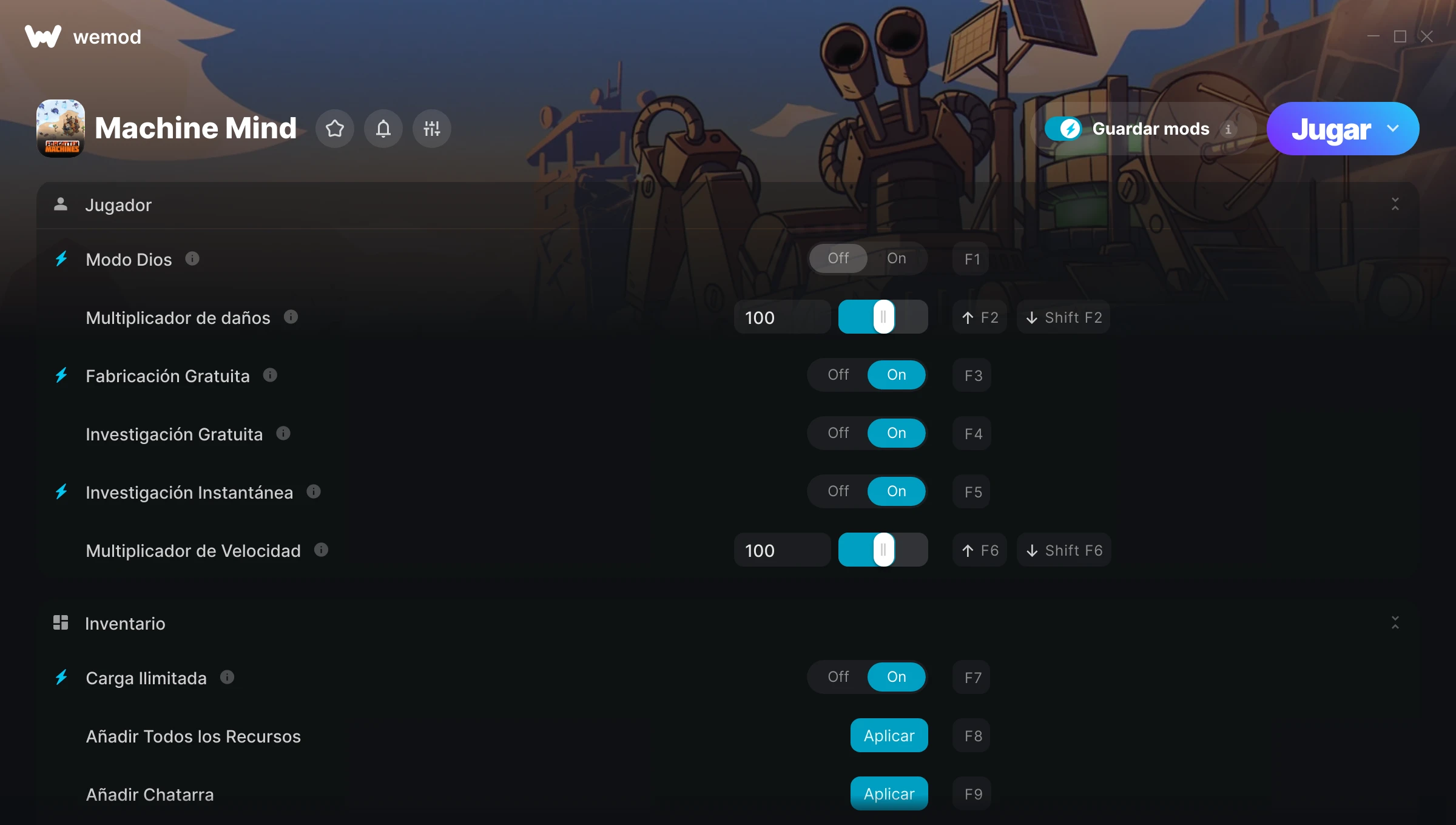 ¿Cómo puedo usar las trampas para Machine Mind?WeMod mostrará todos los juegos en tu PC de forma segura. Abre un juego de la lista y simplemente pulsa jugar. Cuando el juego se haya cargado y estés in-game, podrás empezar a activar las diferentes trampas.¿Funcionará esto con mi versión del juego?WeMod utiliza tecnología avanzada para detectar la versión del juego que tienes y te informará si es compatible. Si no es así, todavía tendrás la opción de probarlo o solicitar una actualización.