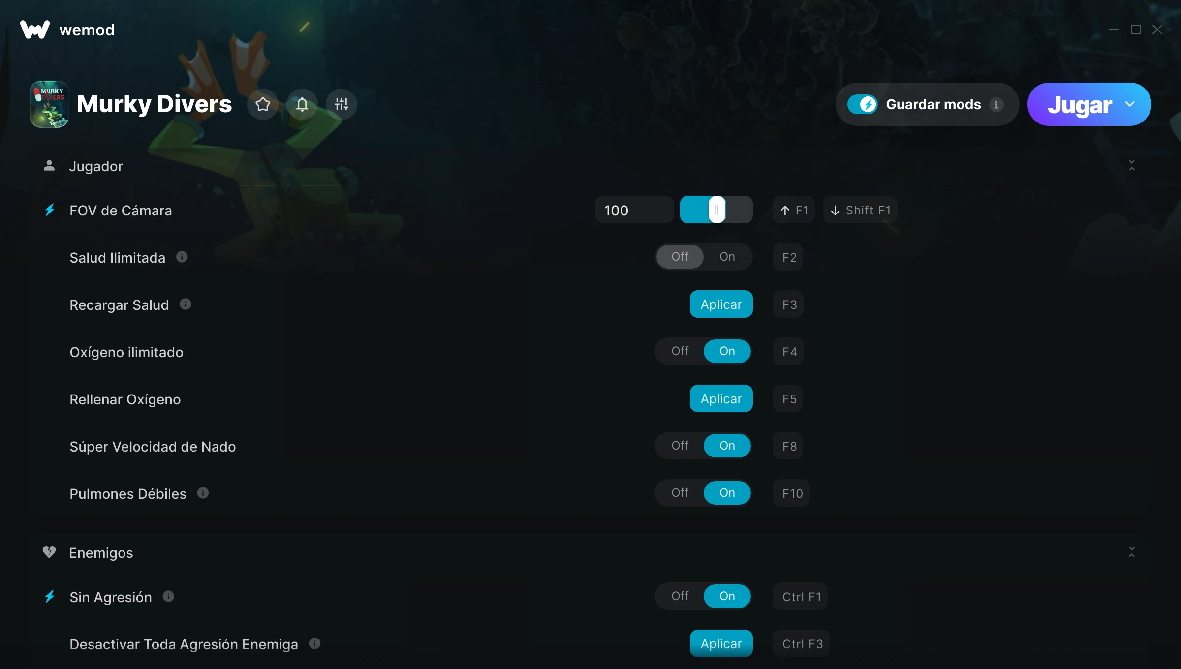 ¿Cómo puedo usar las trampas para Murky Divers?WeMod mostrará todos los juegos en tu PC de forma segura. Abre un juego de la lista y simplemente pulsa jugar. Cuando el juego se haya cargado y estés in-game, podrás empezar a activar las diferentes trampas.¿Funcionará esto con mi versión del juego?WeMod utiliza tecnología avanzada para detectar la versión del juego que tienes y te informará si es compatible. Si no es así, todavía tendrás la opción de probarlo o solicitar una actualización.