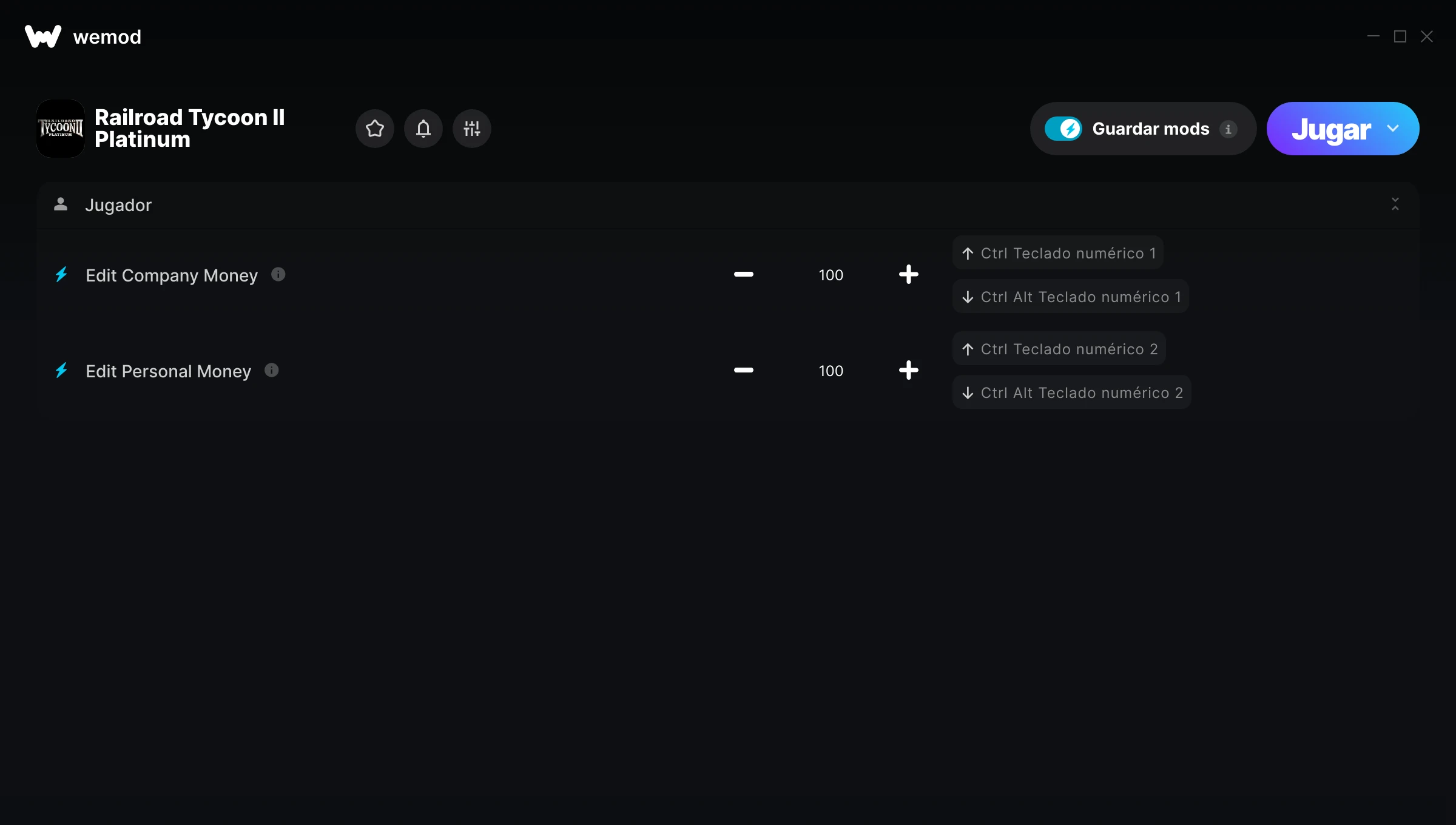 ¿Cómo puedo usar las trampas para Railroad Tycoon II Platinum?WeMod mostrará todos los juegos en tu PC de forma segura. Abre un juego de la lista y simplemente pulsa jugar. Cuando el juego se haya cargado y estés in-game, podrás empezar a activar las diferentes trampas.¿Funcionará esto con mi versión del juego?WeMod utiliza tecnología avanzada para detectar la versión del juego que tienes y te informará si es compatible. Si no es así, todavía tendrás la opción de probarlo o solicitar una actualización.