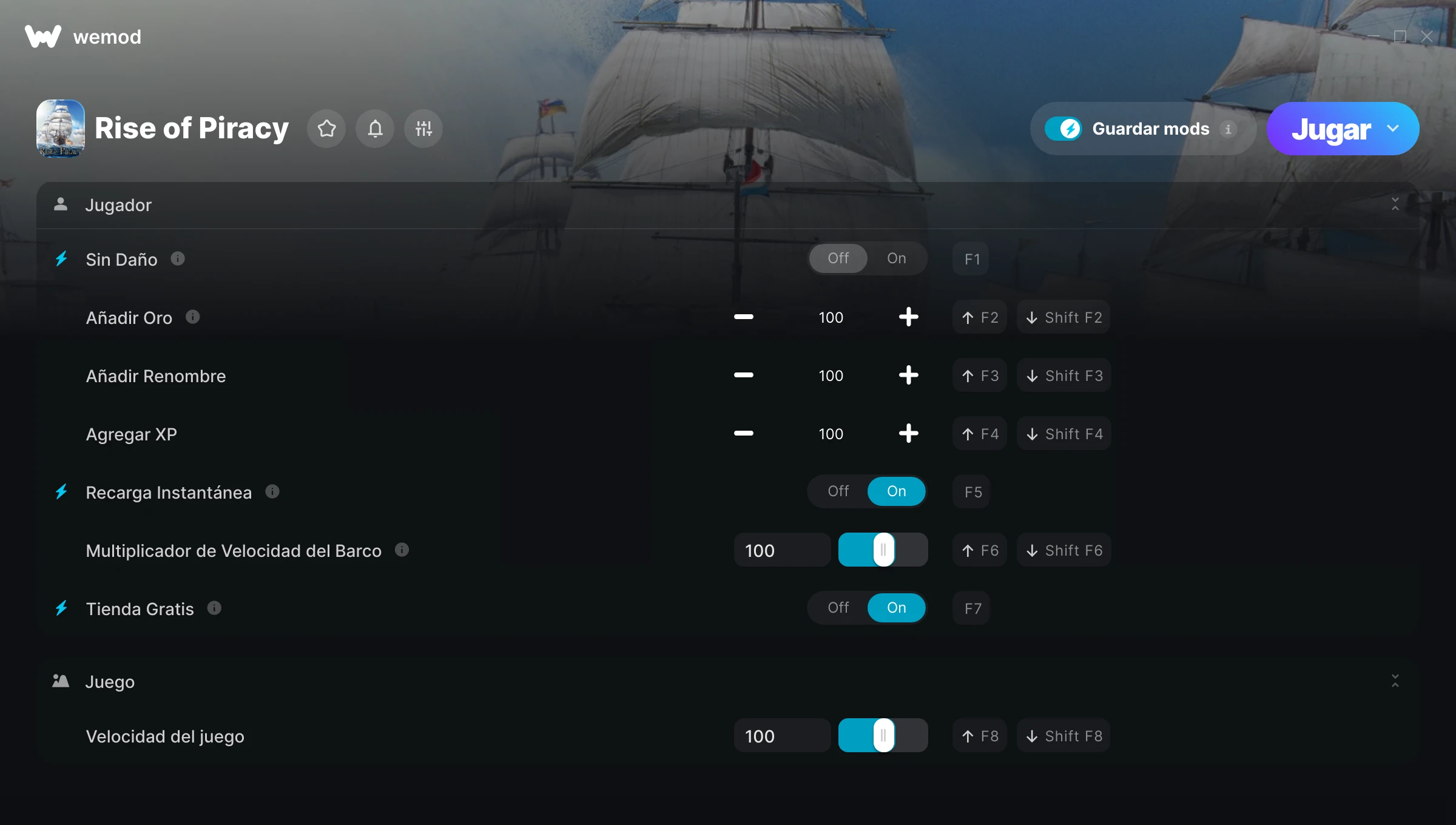 ¿Cómo puedo usar las trampas para Rise of Piracy?WeMod mostrará todos los juegos en tu PC de forma segura. Abre un juego de la lista y simplemente pulsa jugar. Cuando el juego se haya cargado y estés in-game, podrás empezar a activar las diferentes trampas.¿Funcionará esto con mi versión del juego?WeMod utiliza tecnología avanzada para detectar la versión del juego que tienes y te informará si es compatible. Si no es así, todavía tendrás la opción de probarlo o solicitar una actualización.