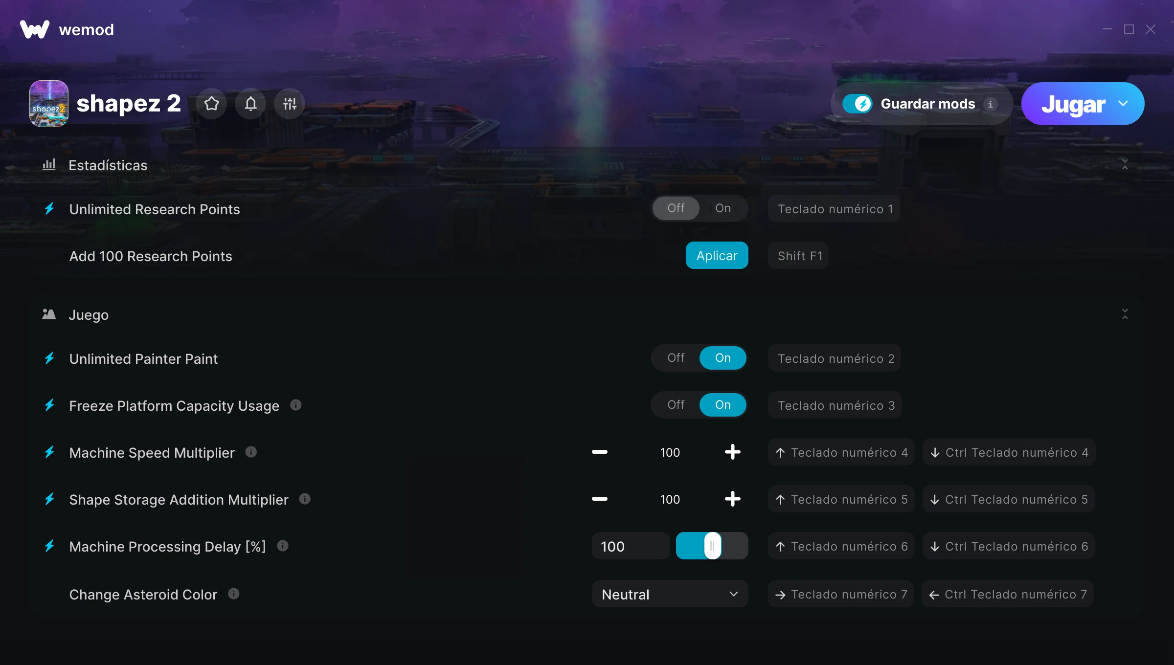 ¿Cómo puedo usar las trampas para shapez 2?WeMod mostrará todos los juegos en tu PC de forma segura. Abre un juego de la lista y simplemente pulsa jugar. Cuando el juego se haya cargado y estés in-game, podrás empezar a activar las diferentes trampas.¿Funcionará esto con mi versión del juego?WeMod utiliza tecnología avanzada para detectar la versión del juego que tienes y te informará si es compatible. Si no es así, todavía tendrás la opción de probarlo o solicitar una actualización.