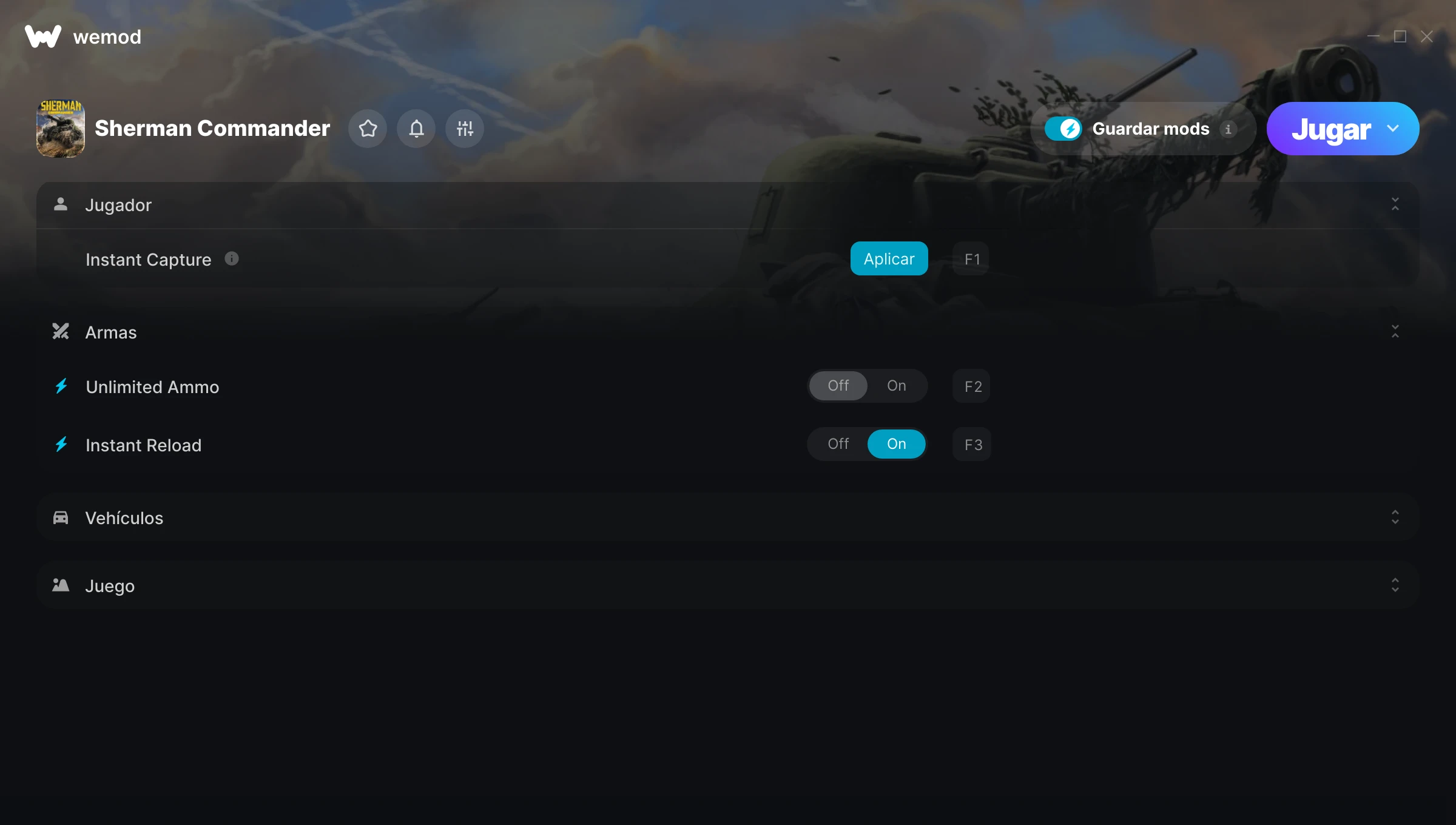 ¿Cómo puedo usar las trampas para Sherman Commander?WeMod mostrará todos los juegos en tu PC de forma segura. Abre un juego de la lista y simplemente pulsa jugar. Cuando el juego se haya cargado y estés in-game, podrás empezar a activar las diferentes trampas.¿Funcionará esto con mi versión del juego?WeMod utiliza tecnología avanzada para detectar la versión del juego que tienes y te informará si es compatible. Si no es así, todavía tendrás la opción de probarlo o solicitar una actualización.
