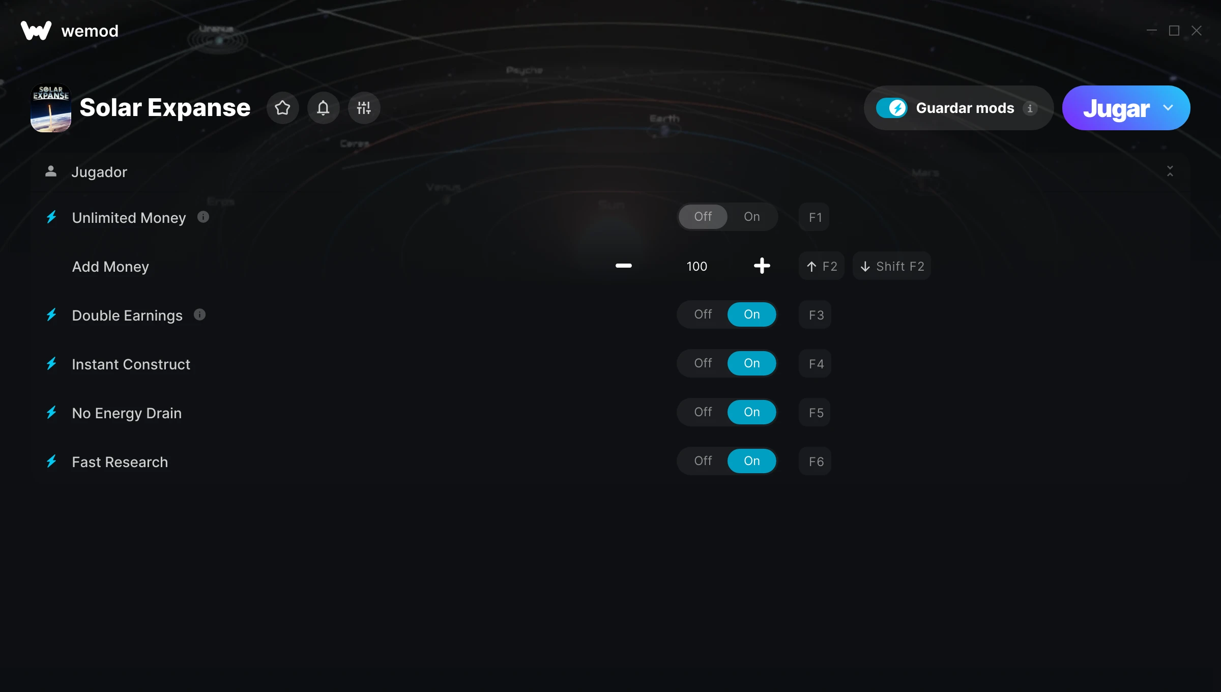 ¿Cómo puedo usar las trampas para Solar Expanse?WeMod mostrará todos los juegos en tu PC de forma segura. Abre un juego de la lista y simplemente pulsa jugar. Cuando el juego se haya cargado y estés in-game, podrás empezar a activar las diferentes trampas.¿Funcionará esto con mi versión del juego?WeMod utiliza tecnología avanzada para detectar la versión del juego que tienes y te informará si es compatible. Si no es así, todavía tendrás la opción de probarlo o solicitar una actualización.