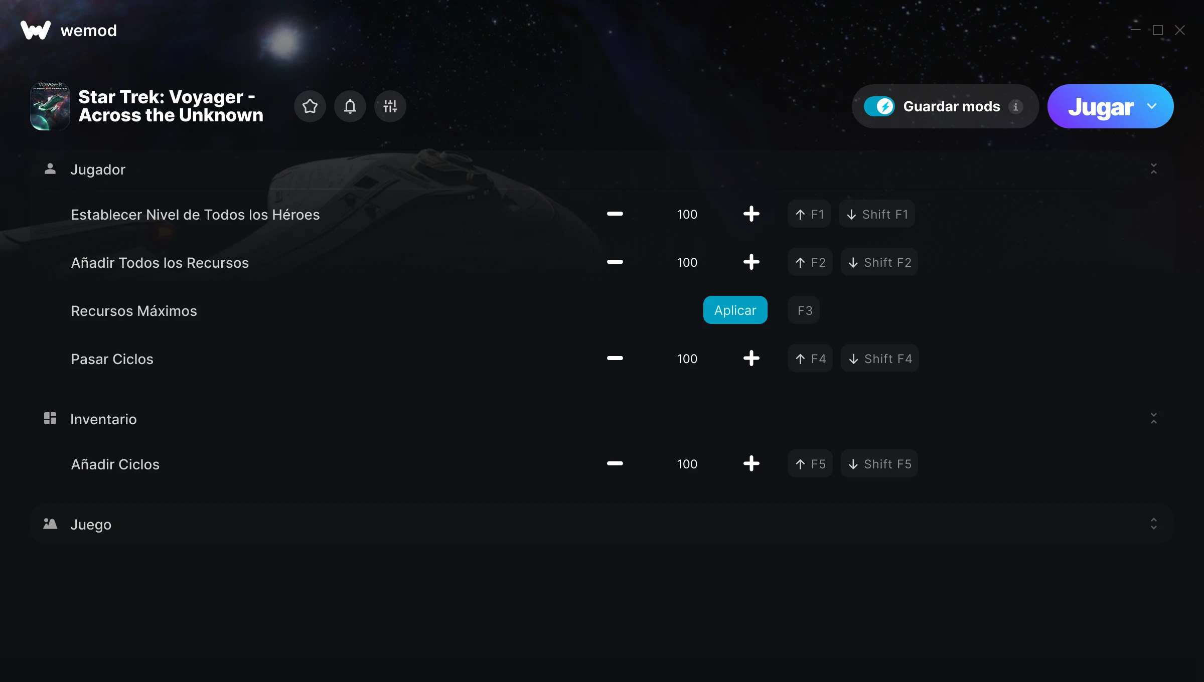 ¿Cómo puedo usar las trampas para Star Trek: Voyager - Across the Unknown?WeMod mostrará todos los juegos en tu PC de forma segura. Abre un juego de la lista y simplemente pulsa jugar. Cuando el juego se haya cargado y estés in-game, podrás empezar a activar las diferentes trampas.¿Funcionará esto con mi versión del juego?WeMod utiliza tecnología avanzada para detectar la versión del juego que tienes y te informará si es compatible. Si no es así, todavía tendrás la opción de probarlo o solicitar una actualización.