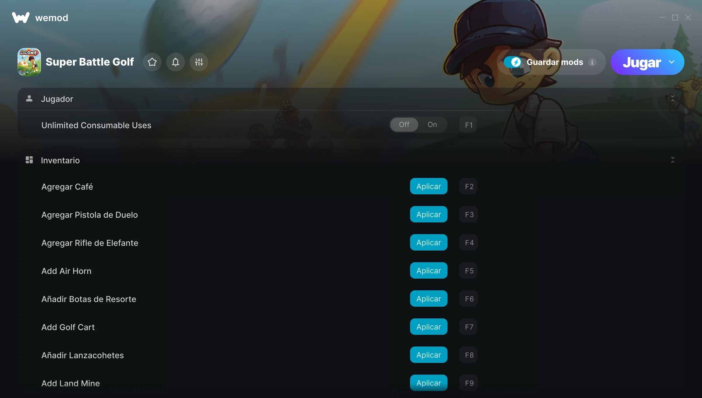 ¿Cómo puedo usar las trampas para Super Battle Golf?WeMod mostrará todos los juegos en tu PC de forma segura. Abre un juego de la lista y simplemente pulsa jugar. Cuando el juego se haya cargado y estés in-game, podrás empezar a activar las diferentes trampas.¿Funcionará esto con mi versión del juego?WeMod utiliza tecnología avanzada para detectar la versión del juego que tienes y te informará si es compatible. Si no es así, todavía tendrás la opción de probarlo o solicitar una actualización.