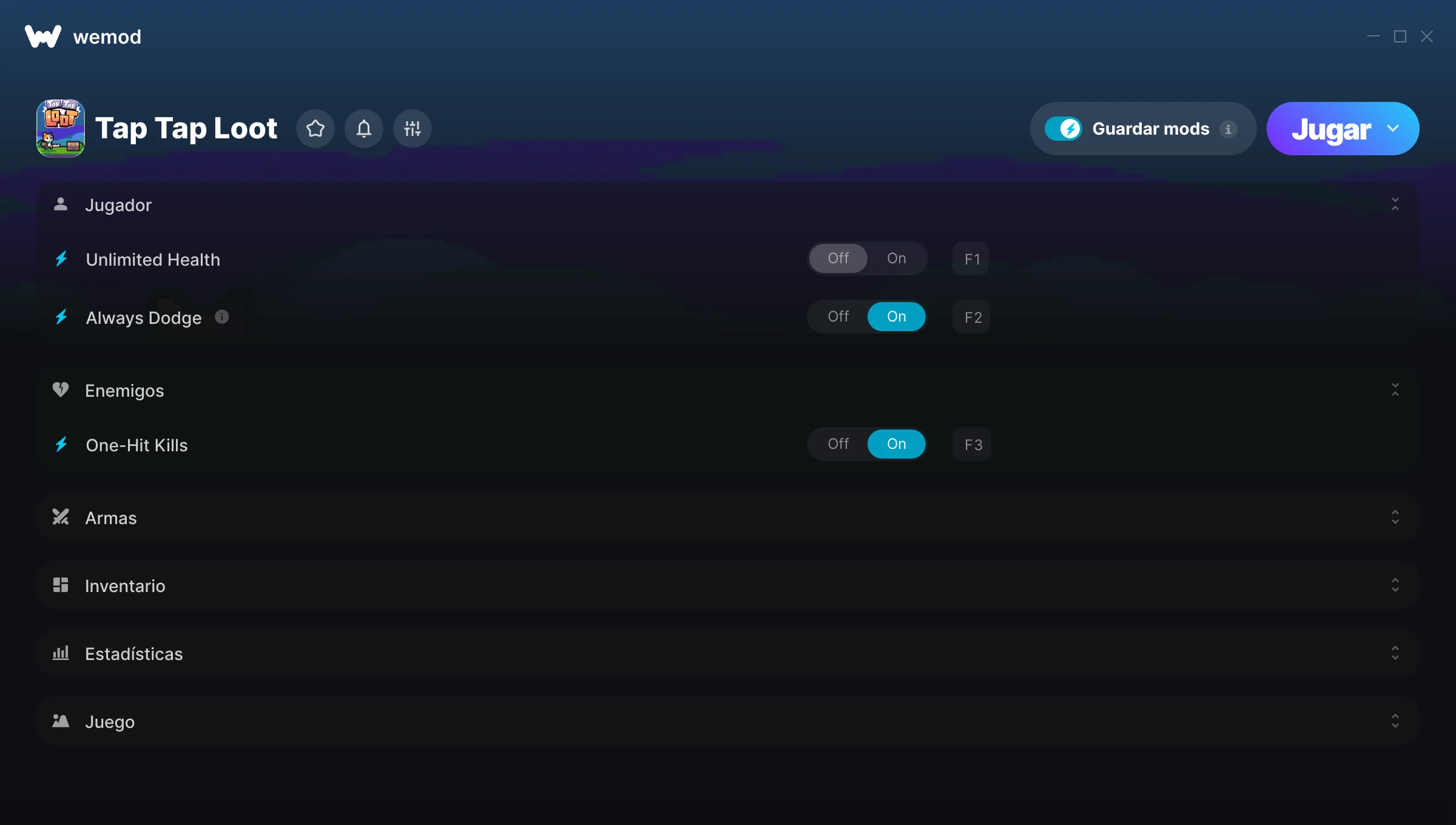 ¿Cómo puedo usar las trampas para Tap Tap Loot?WeMod mostrará todos los juegos en tu PC de forma segura. Abre un juego de la lista y simplemente pulsa jugar. Cuando el juego se haya cargado y estés in-game, podrás empezar a activar las diferentes trampas.¿Funcionará esto con mi versión del juego?WeMod utiliza tecnología avanzada para detectar la versión del juego que tienes y te informará si es compatible. Si no es así, todavía tendrás la opción de probarlo o solicitar una actualización.