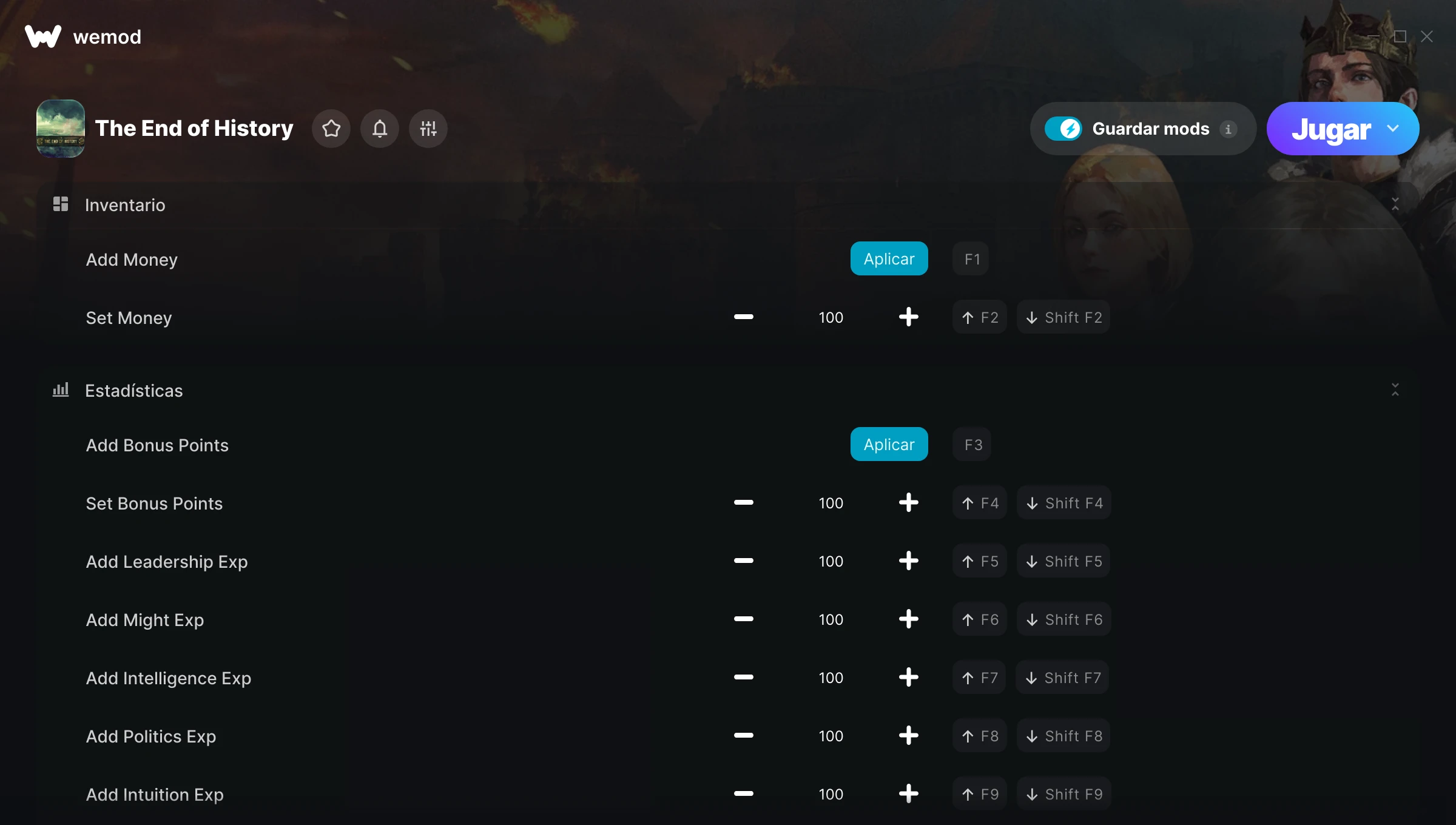 ¿Cómo puedo usar las trampas para The End of History?WeMod mostrará todos los juegos en tu PC de forma segura. Abre un juego de la lista y simplemente pulsa jugar. Cuando el juego se haya cargado y estés in-game, podrás empezar a activar las diferentes trampas.¿Funcionará esto con mi versión del juego?WeMod utiliza tecnología avanzada para detectar la versión del juego que tienes y te informará si es compatible. Si no es así, todavía tendrás la opción de probarlo o solicitar una actualización.