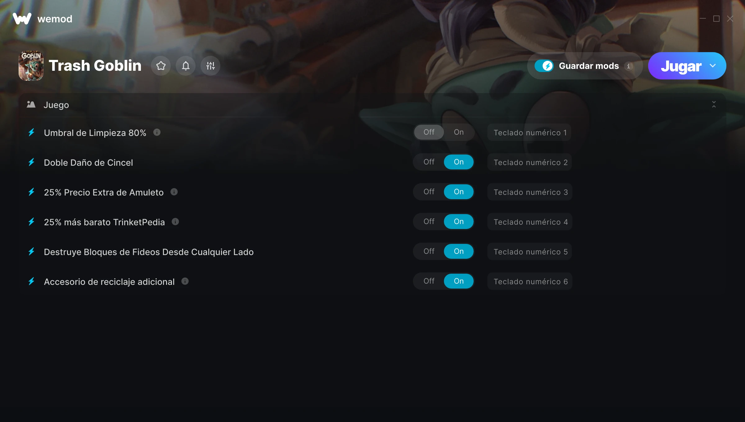 ¿Cómo puedo usar las trampas para Trash Goblin?WeMod mostrará todos los juegos en tu PC de forma segura. Abre un juego de la lista y simplemente pulsa jugar. Cuando el juego se haya cargado y estés in-game, podrás empezar a activar las diferentes trampas.¿Funcionará esto con mi versión del juego?WeMod utiliza tecnología avanzada para detectar la versión del juego que tienes y te informará si es compatible. Si no es así, todavía tendrás la opción de probarlo o solicitar una actualización.