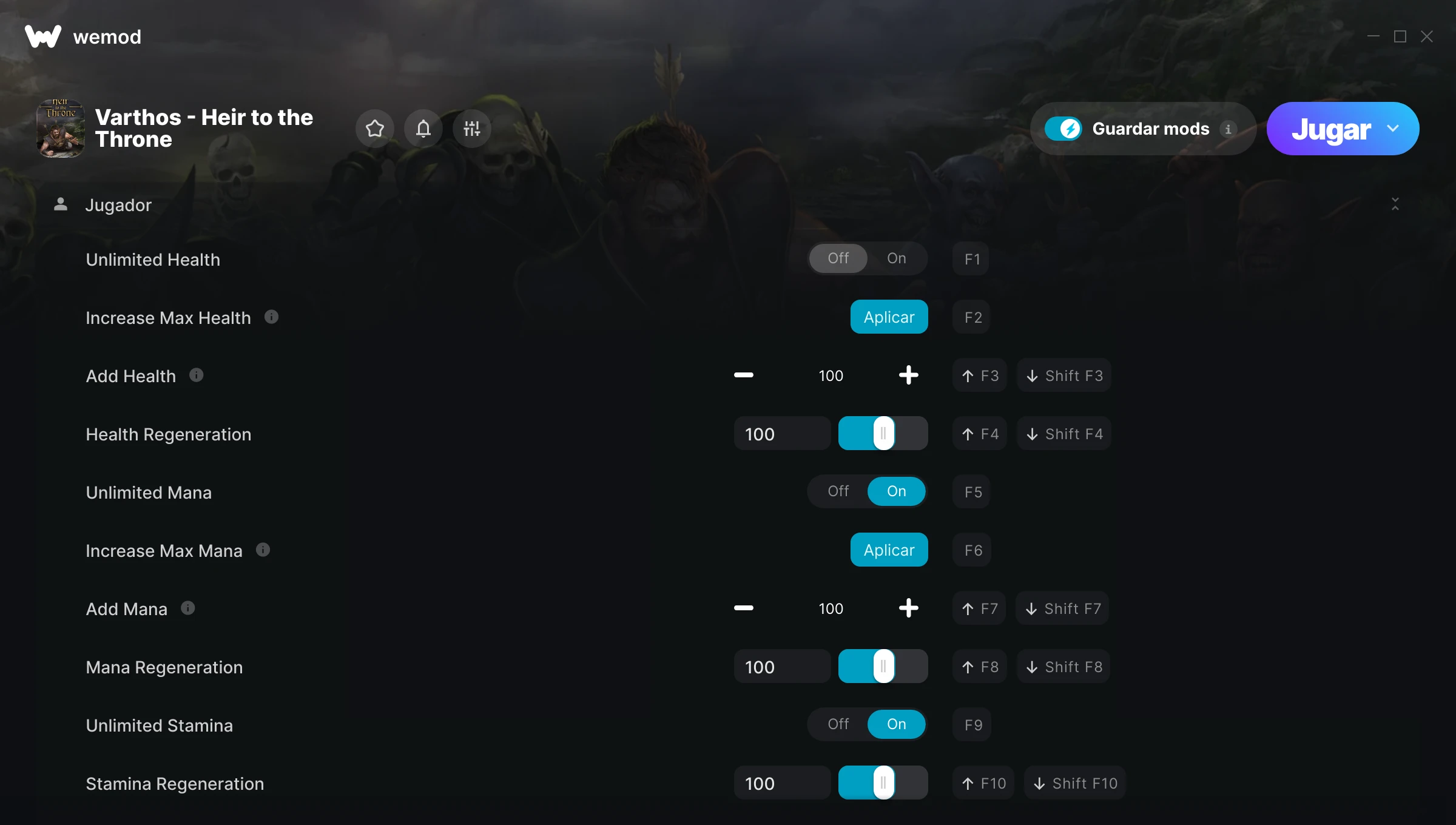 ¿Cómo puedo usar las trampas para Varthos - Heir to the Throne?WeMod mostrará todos los juegos en tu PC de forma segura. Abre un juego de la lista y simplemente pulsa jugar. Cuando el juego se haya cargado y estés in-game, podrás empezar a activar las diferentes trampas.¿Funcionará esto con mi versión del juego?WeMod utiliza tecnología avanzada para detectar la versión del juego que tienes y te informará si es compatible. Si no es así, todavía tendrás la opción de probarlo o solicitar una actualización.