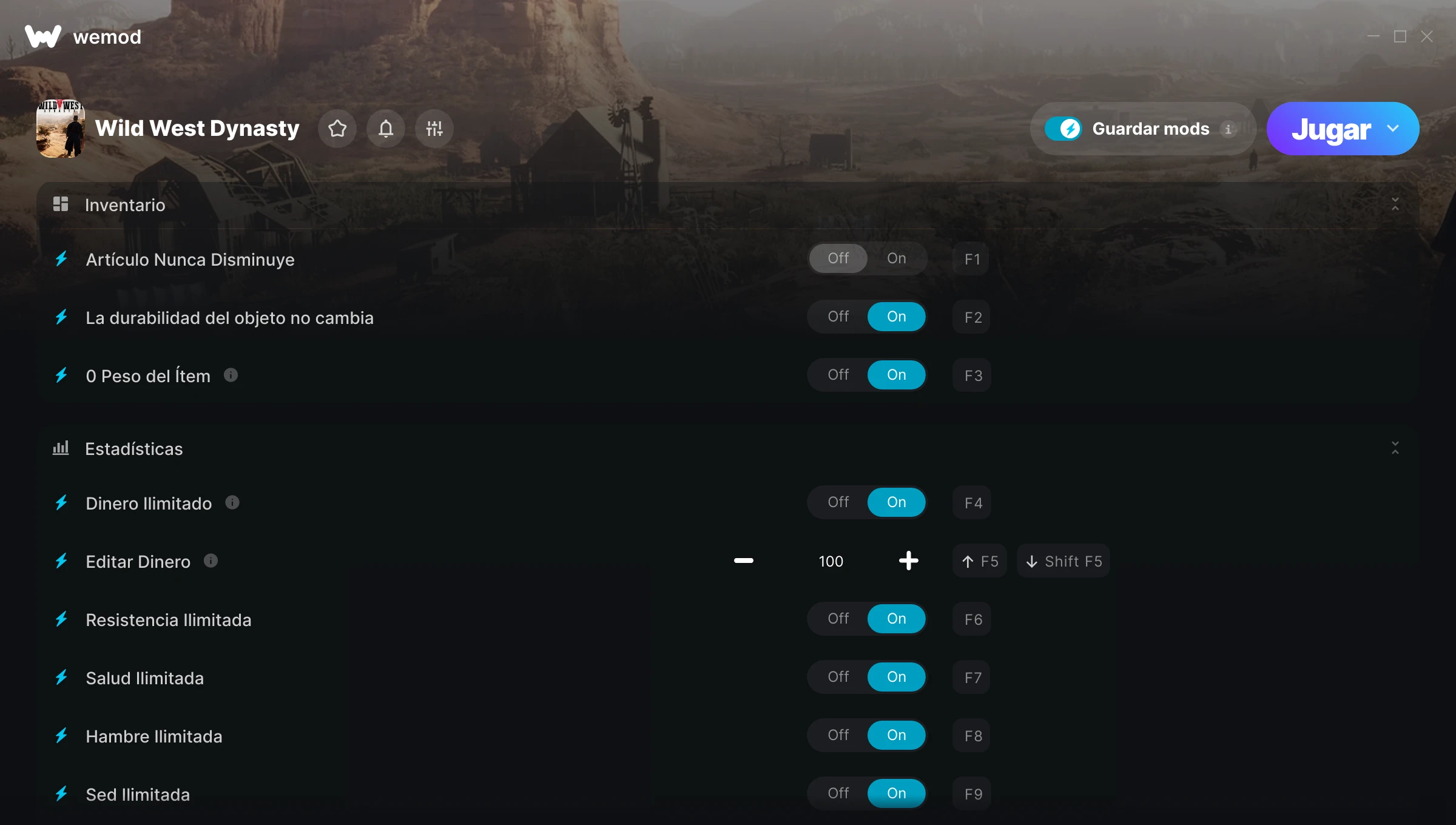¿Cómo puedo usar las trampas para Wild West Legacy?WeMod mostrará todos los juegos en tu PC de forma segura. Abre un juego de la lista y simplemente pulsa jugar. Cuando el juego se haya cargado y estés in-game, podrás empezar a activar las diferentes trampas.¿Funcionará esto con mi versión del juego?WeMod utiliza tecnología avanzada para detectar la versión del juego que tienes y te informará si es compatible. Si no es así, todavía tendrás la opción de probarlo o solicitar una actualización.